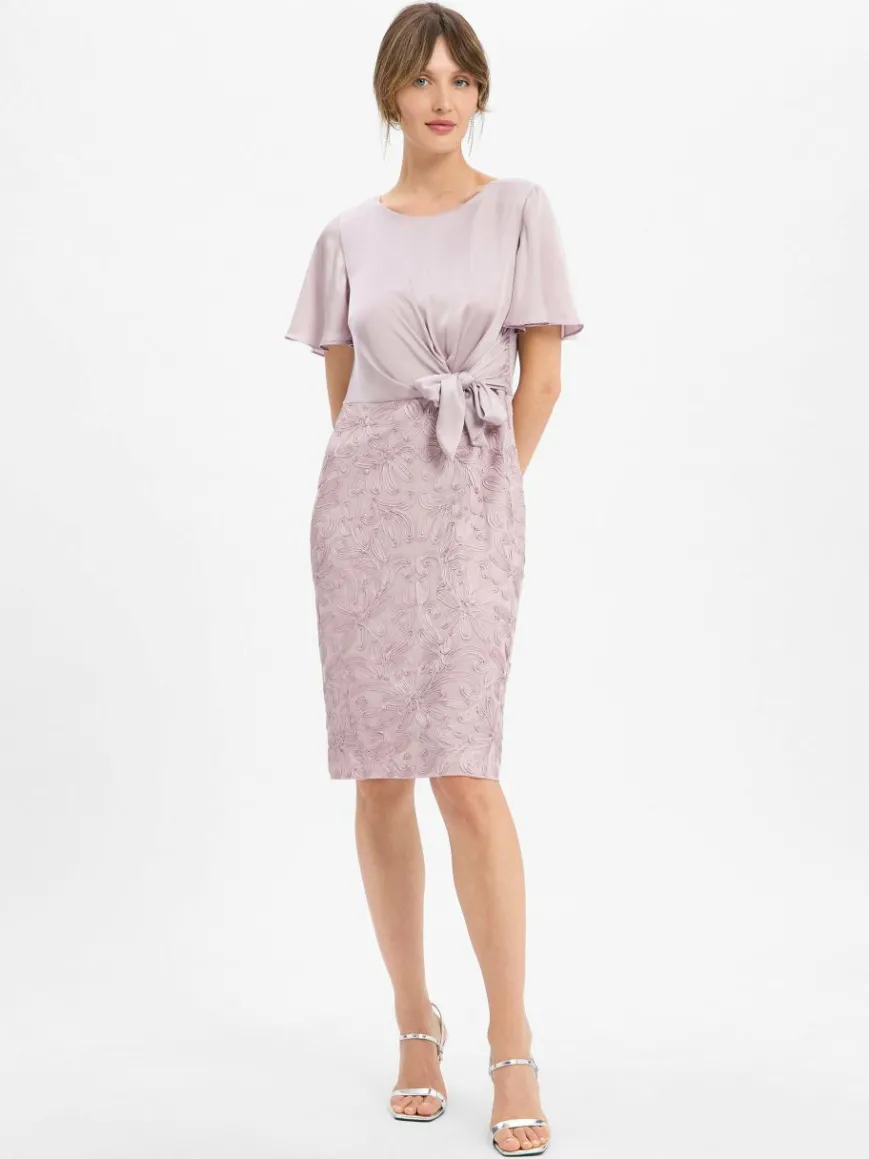 Das Abendkleid von Ambiance zeigt sich im raffinierten Design mit Raffung und seitlichem Bindeband sowie tonigen Bordüren auf dem Rockteil.