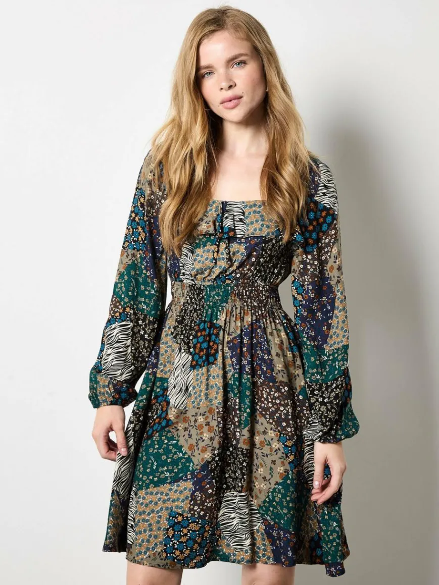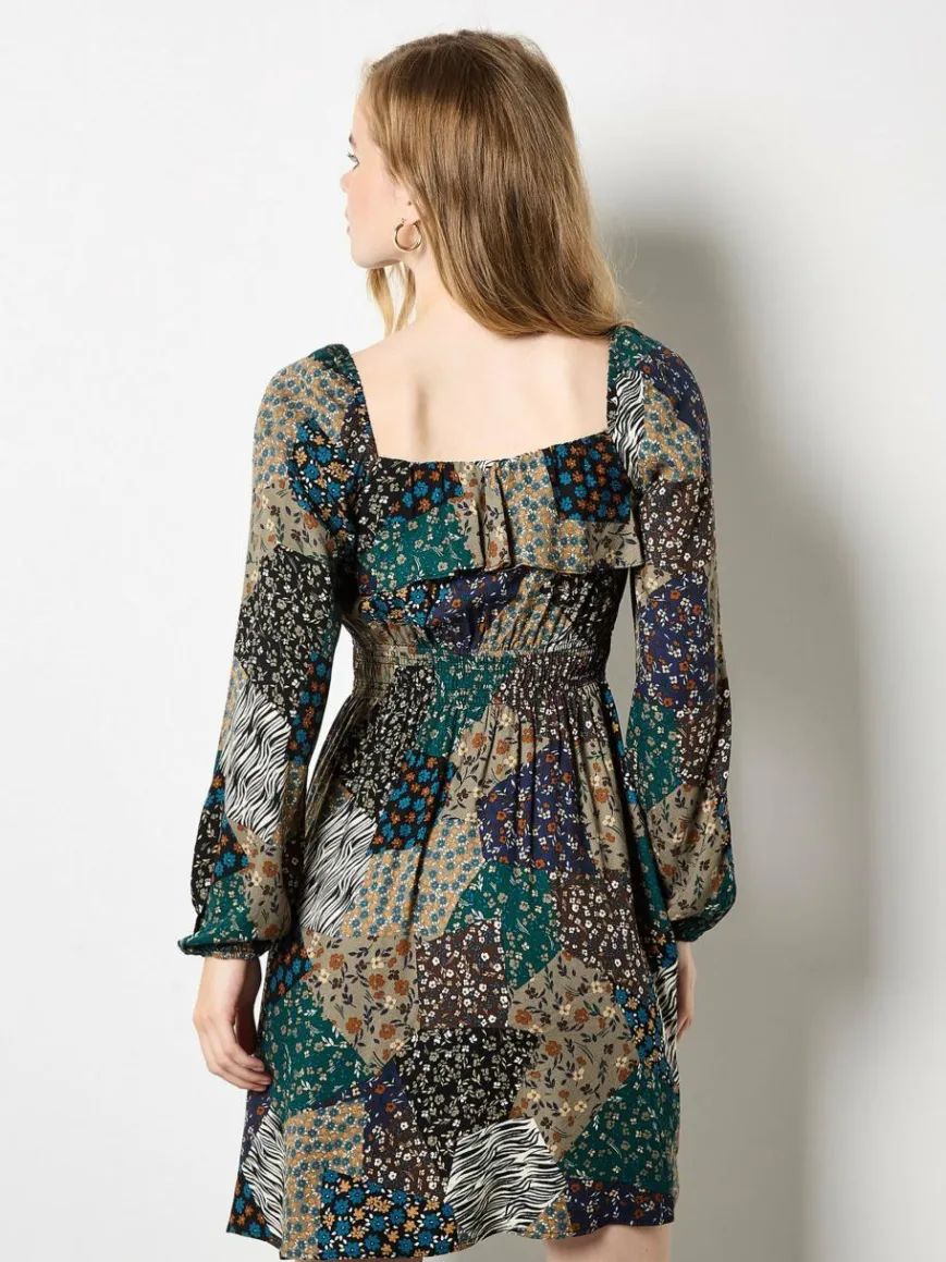 Entdecken Sie den Boho-Chic-Stil mit diesem Minikleid mit Patchwork-Print. Es kombiniert feminine Blumenmuster mit Zebradruck und besticht durch einen Herzausschnitt mit Rüschendetails, eine gesmokte Taille für eine besonders vorteilhafte Passform und Ballonärmel.
