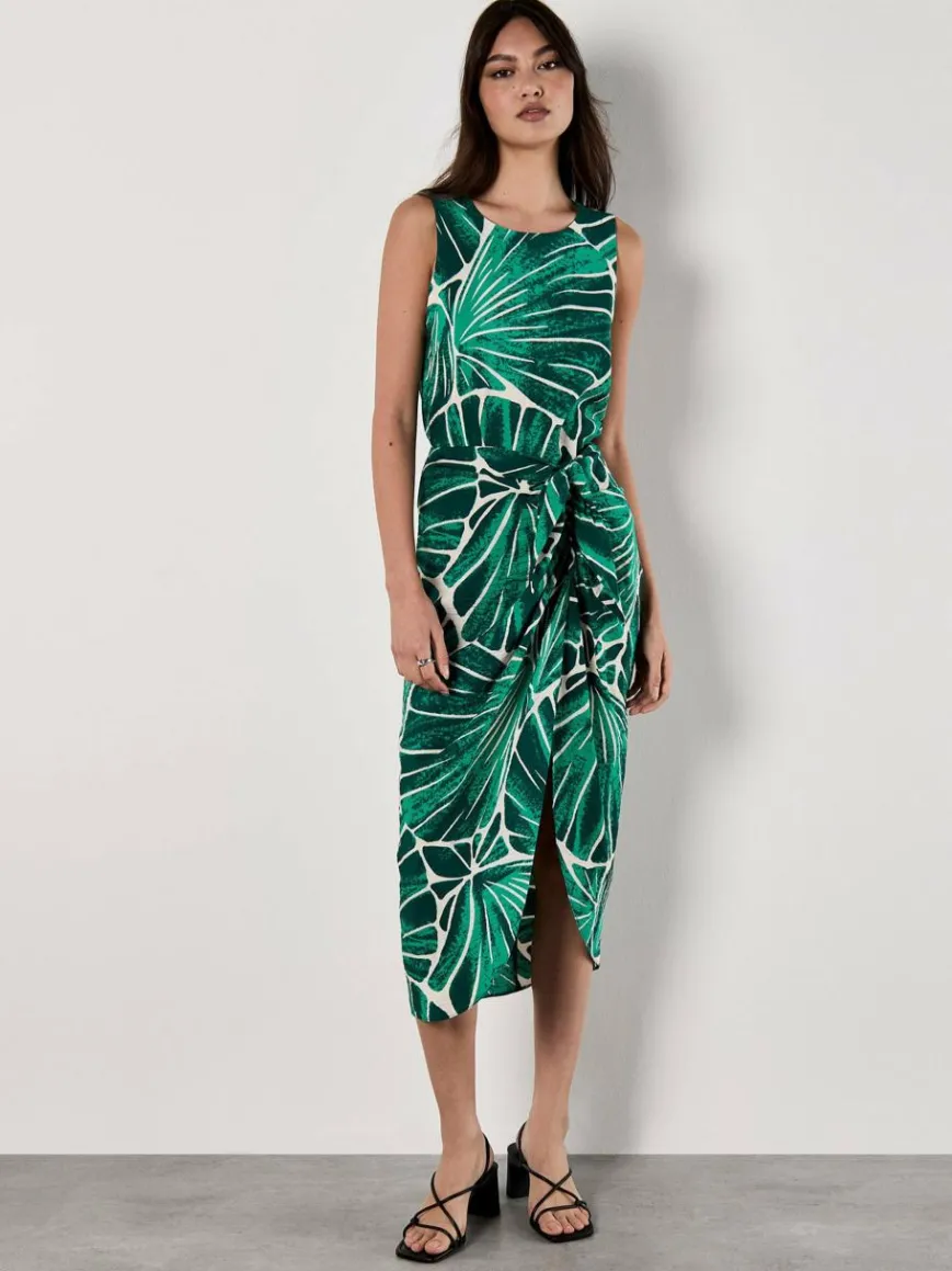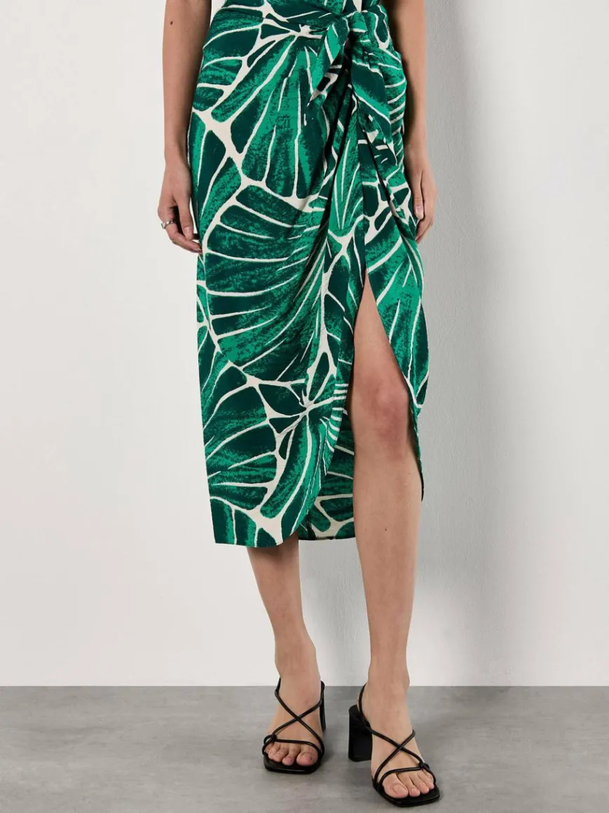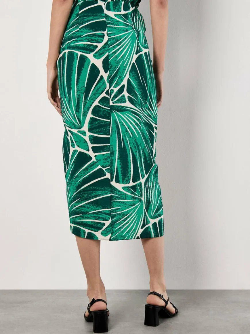 Dieser Rock mit abstraktem Palmenmuster verleiht Ihrer Garderobe einen Hauch von tropischem Flair. Er ist leicht und gewebt, hat ein schmeichelhaftes Wickeldesign und fällt auf eine Midi-Länge. Er ist mit einem Reißverschluss auf der Rückseite und einem Stoffgürtel ausgestattet, der für eine perfekte Passform sorgt.