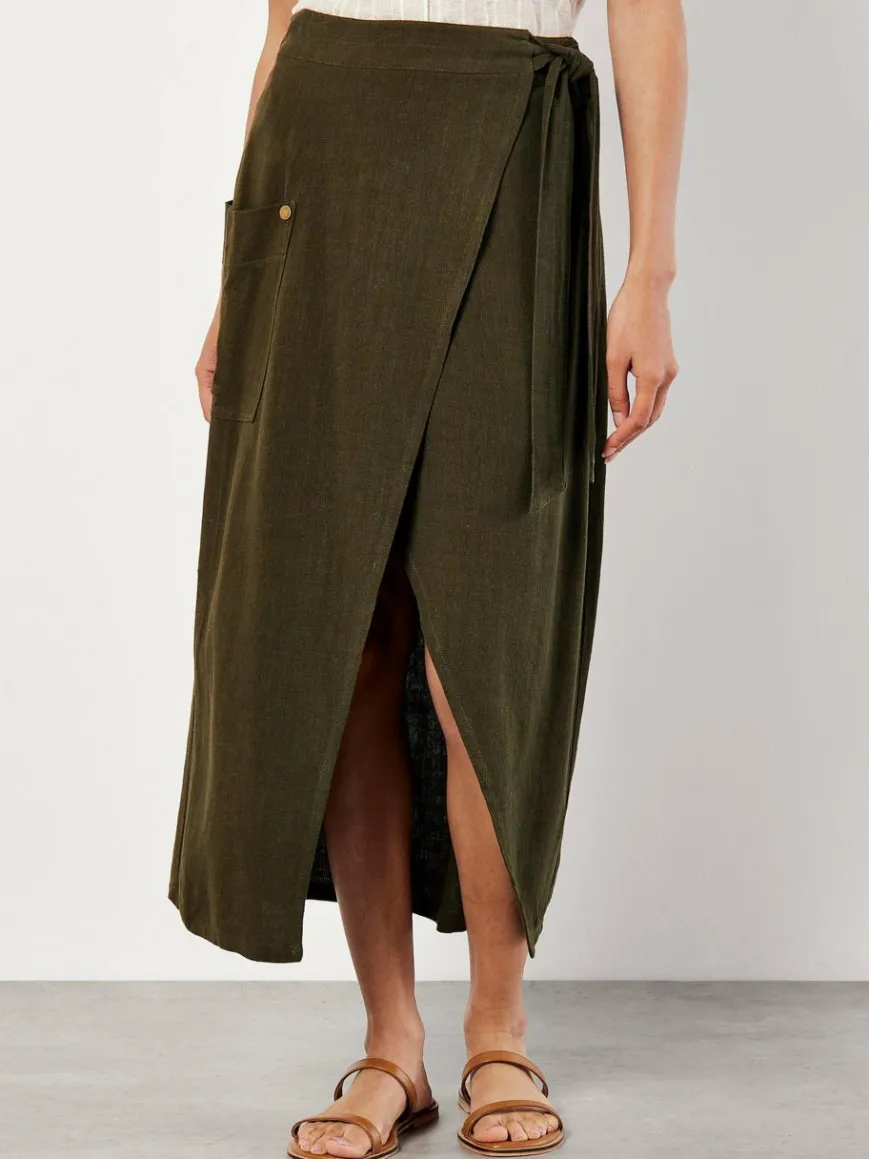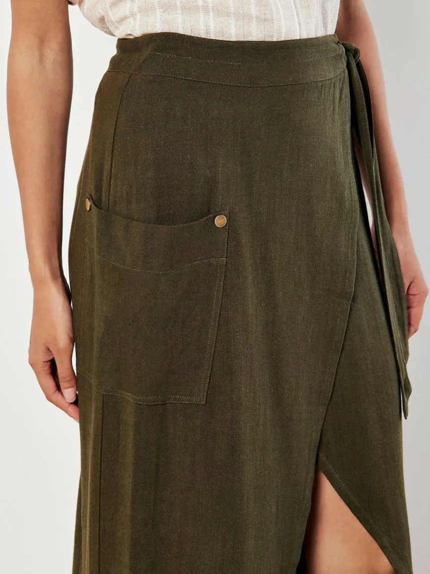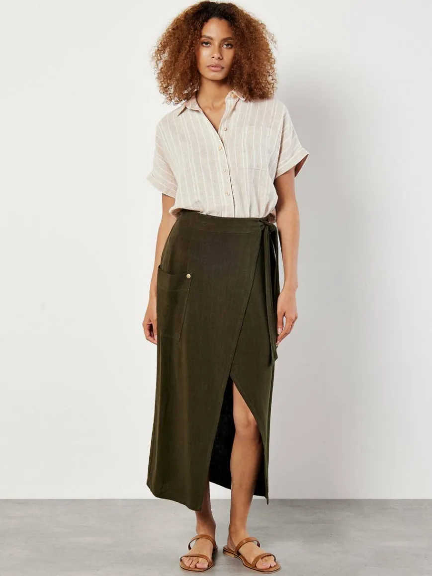 Mit diesem Rock aus einer Leinenmischung liegen Sie voll im Utility-Trend. Der schmeichelhafte Wickelrock hat eine Midi-Länge und ist mit einem Stoffgürtel versehen, der für eine perfekte Passform sorgt, sowie mit einer Cargotasche an der Seite.