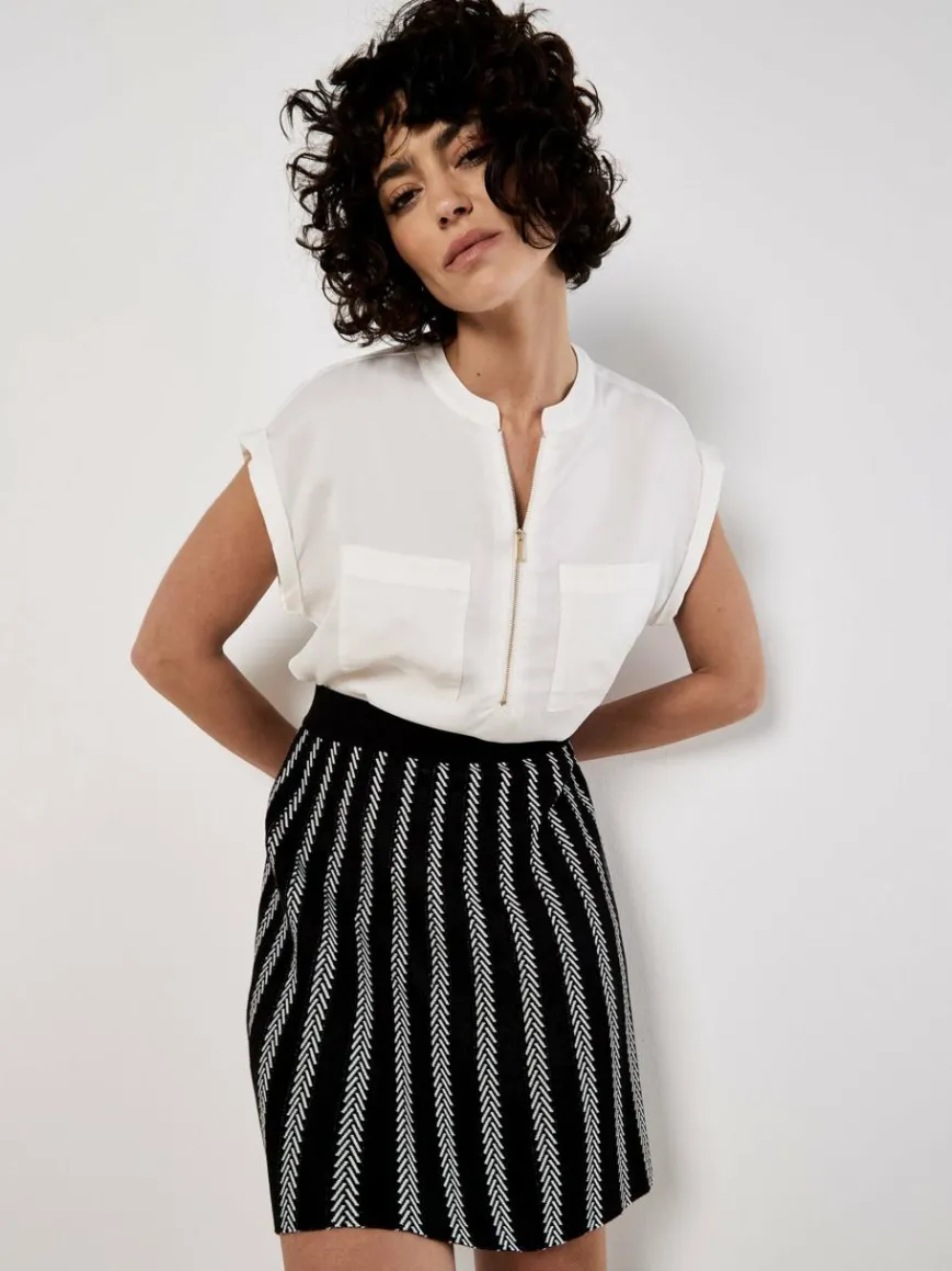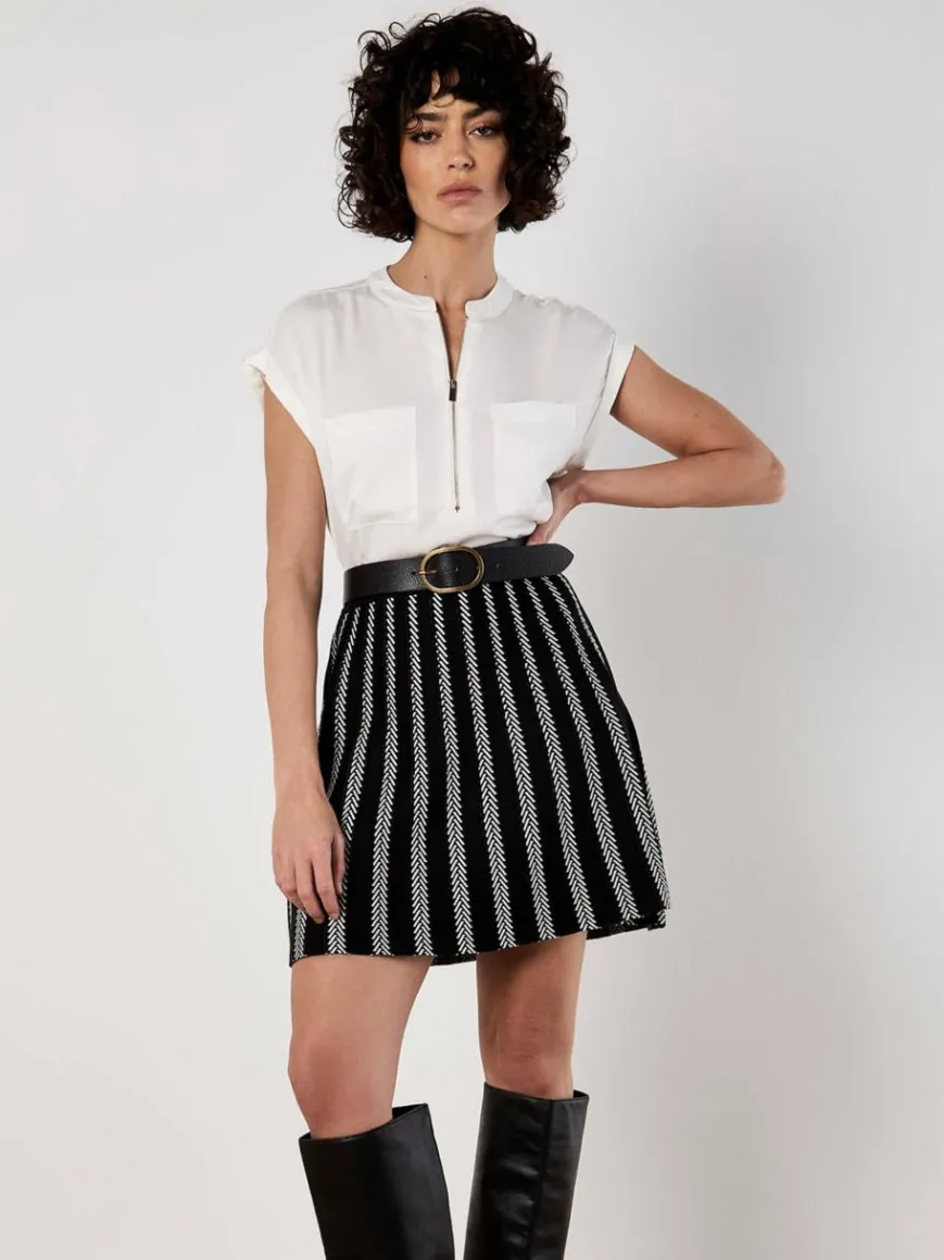Dieser schicke Rock kombiniert eine monochromatische Farbpalette mit einem zeitlosen Chevron-Streifenmuster. Er ist aus mittelschwerem Strick gefertigt und hat eine Minilänge.