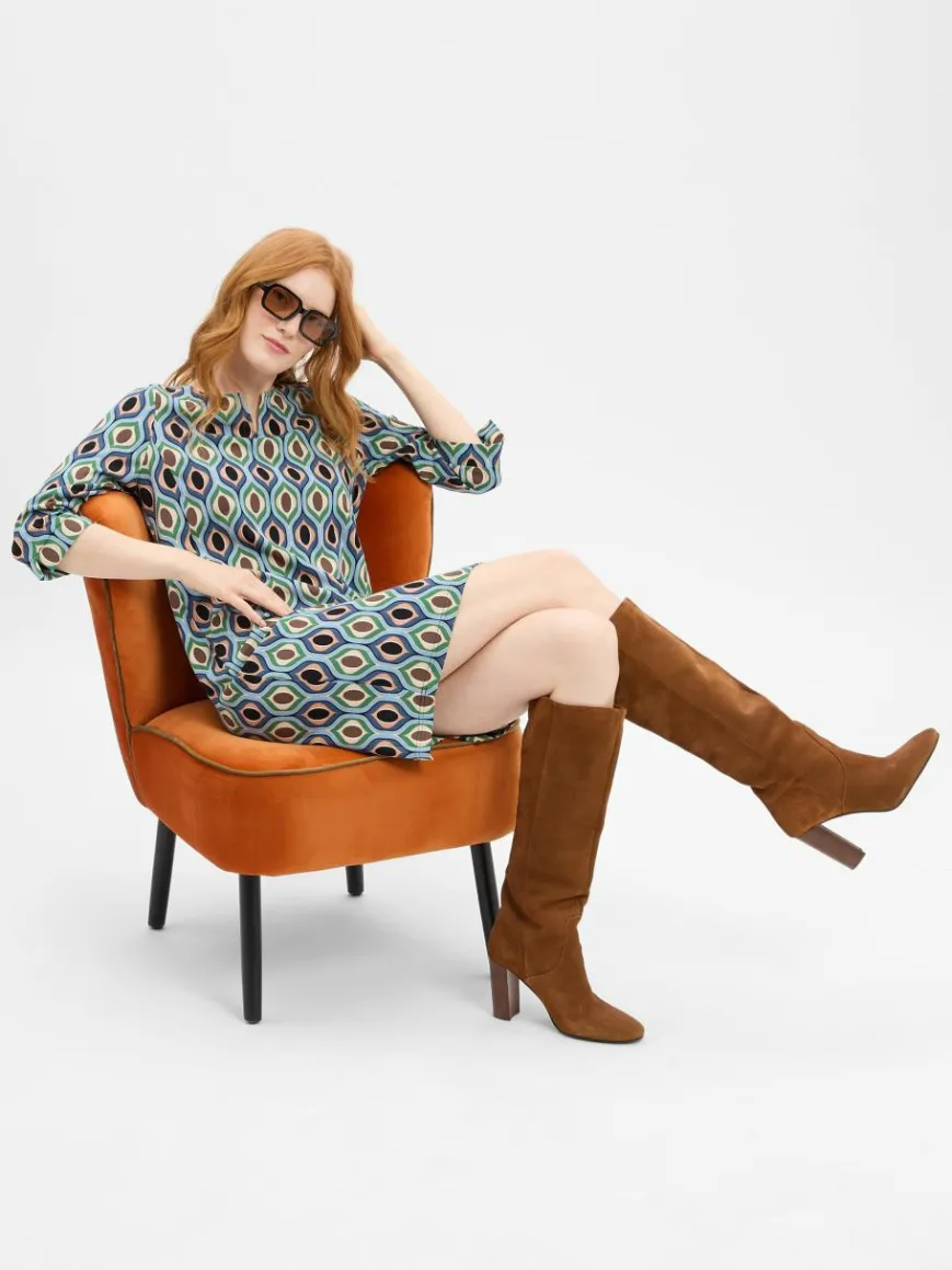 Das Kleid von Cartoon schmeichelt der Figur durch formgebende Nähte, während versteckte Eingrifftaschen und Dreiviertelärmel die Alltagstauglichkeit unterstreichen.