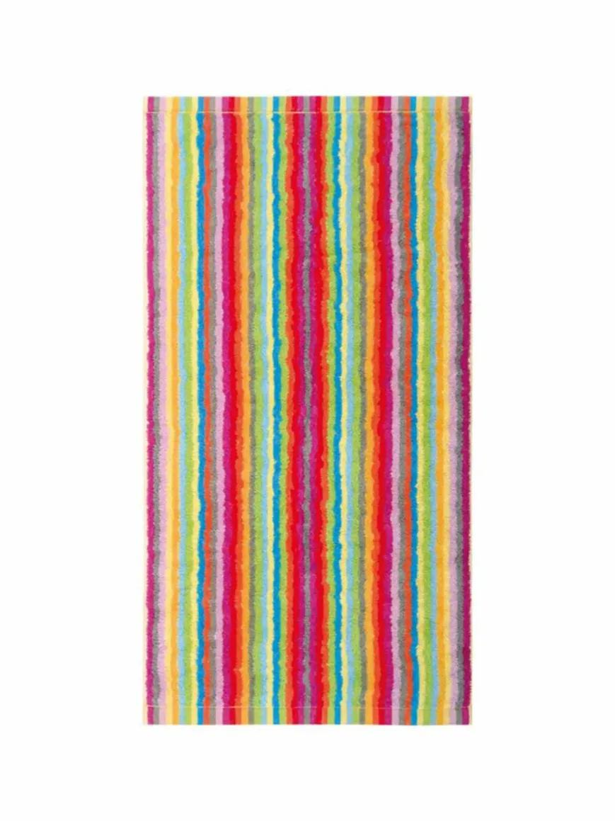 Farbenfrohes Duschtuch von der Marke CAWÖ. Mehrfarbiges Streifen-Design in extraflauschiger Walkfrottier-Qualität. 100% Baumwolle – hautfreundlich, pflegeleicht, trocknergeeignet.