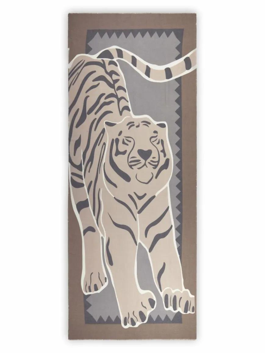 Animal-Schals sind ein ultimatives Statement-Piece. Vor allem, wenn sie sich so schön exotisch zeigen, wie dieser weiche Schal mit dekorativem XL-Tiger. Wenn du möchtest, dass man den Tiger in voller Größe sehen kann, trägst du den Schal am besten wie eine Stola breit über die Schultern gelegt. Der Schal ist aus unserer Winter Bestseller-Qualität #10 CASHMERE TOUCH gefertigt.