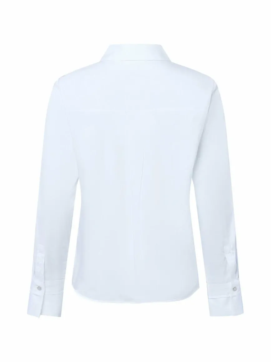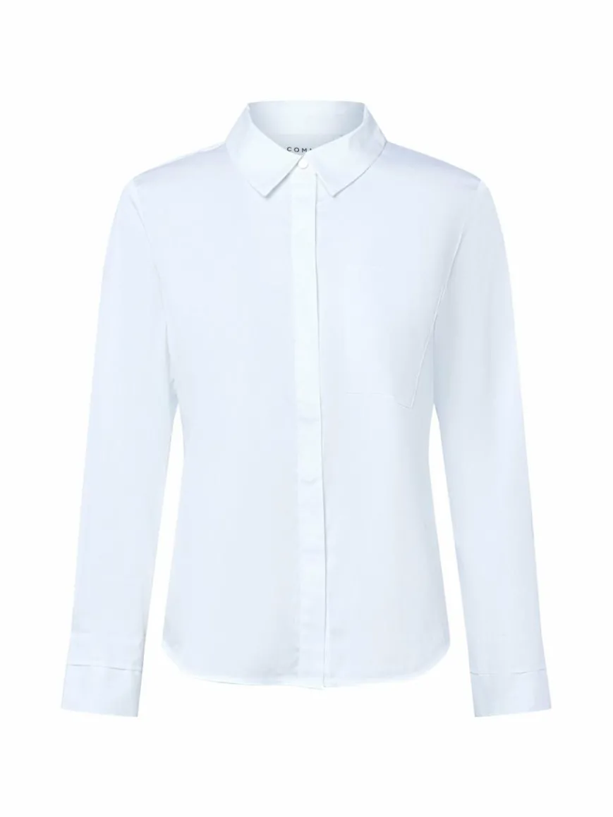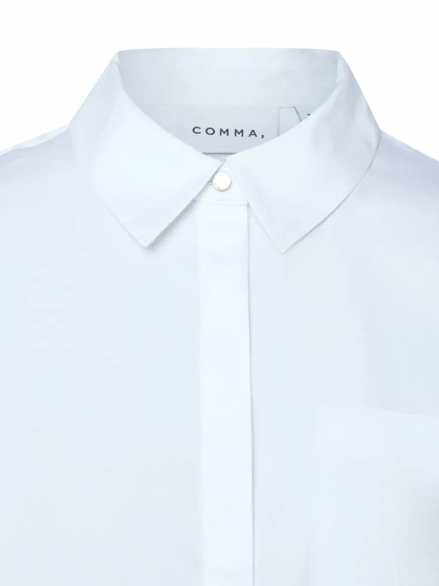 Dezente Logo-Details zieren die moderne Hemdbluse von comma aus stretchigem Baumwollmix mit verdeckter Knopfleiste und einer aufgesetzten Brusttasche.