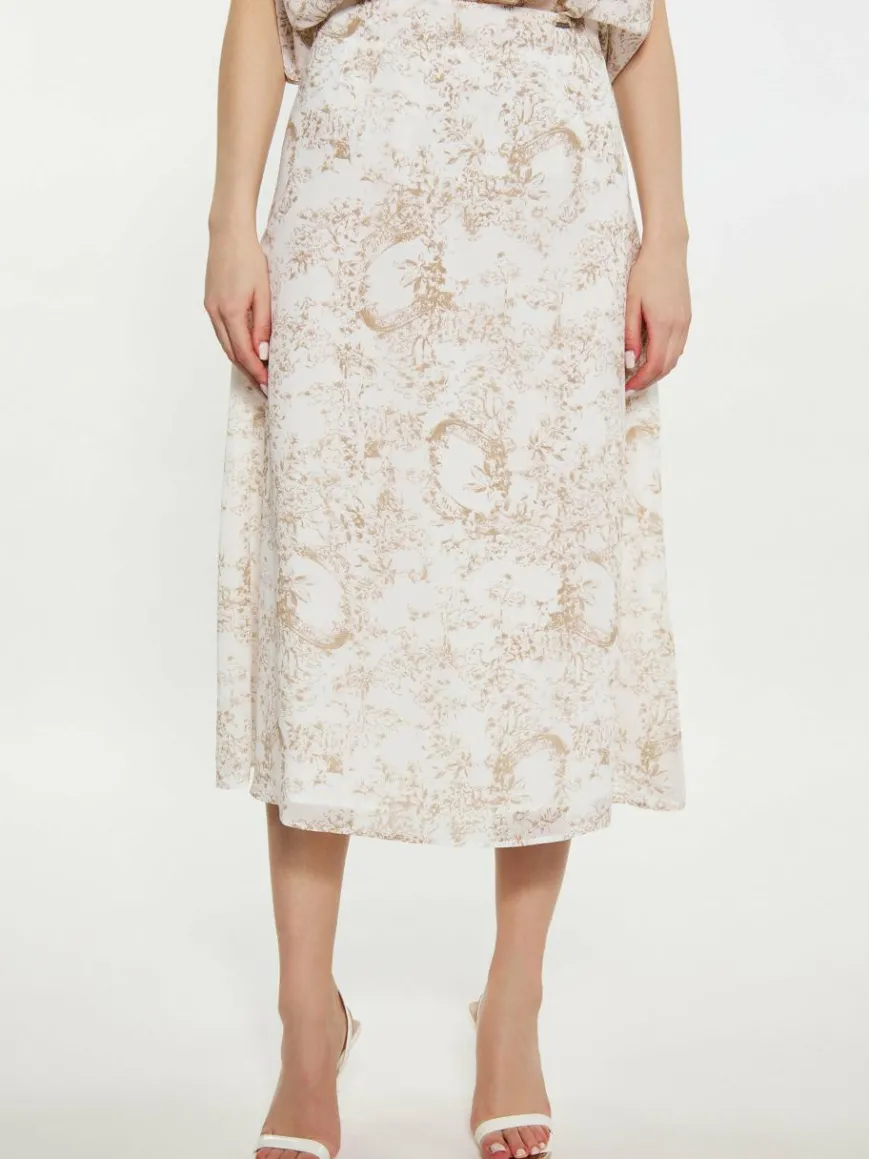Discover an elegant midi skirt with a classic A-line. This elegant garment showcases intricate floral prints, creating a timeless and sophisticated look. A fitted waist and a slight flare at the hem make this skirt exude casual style.
