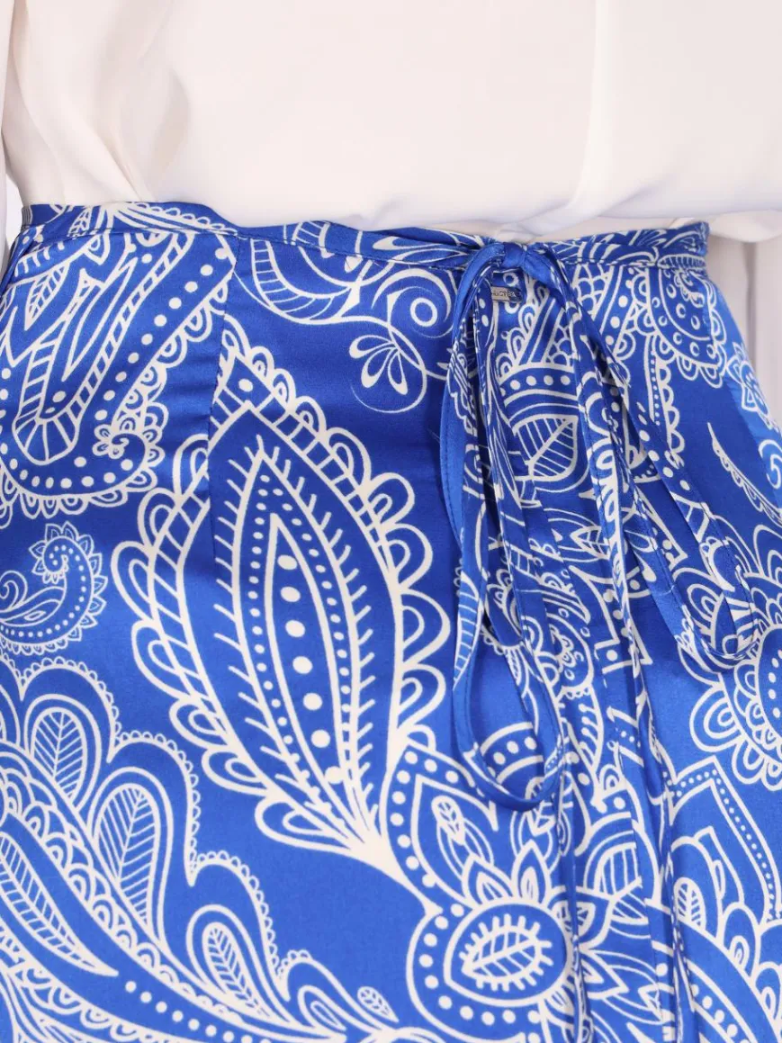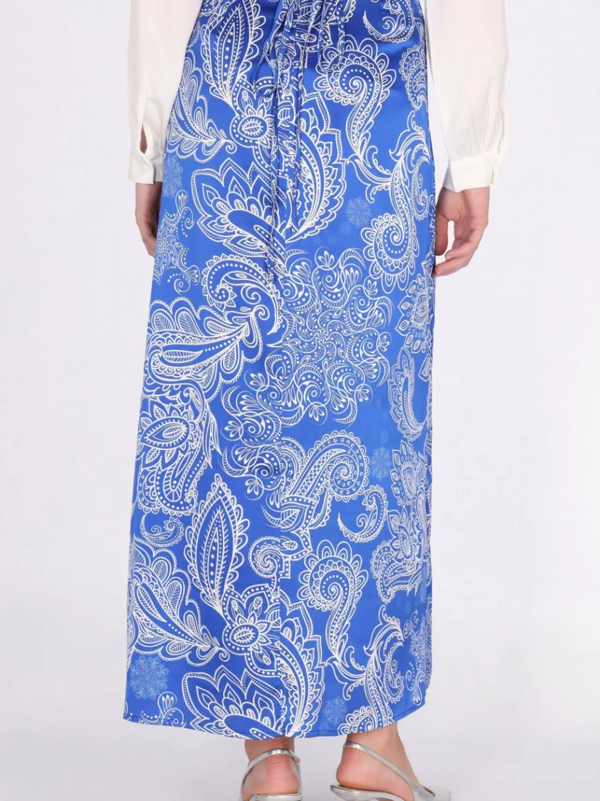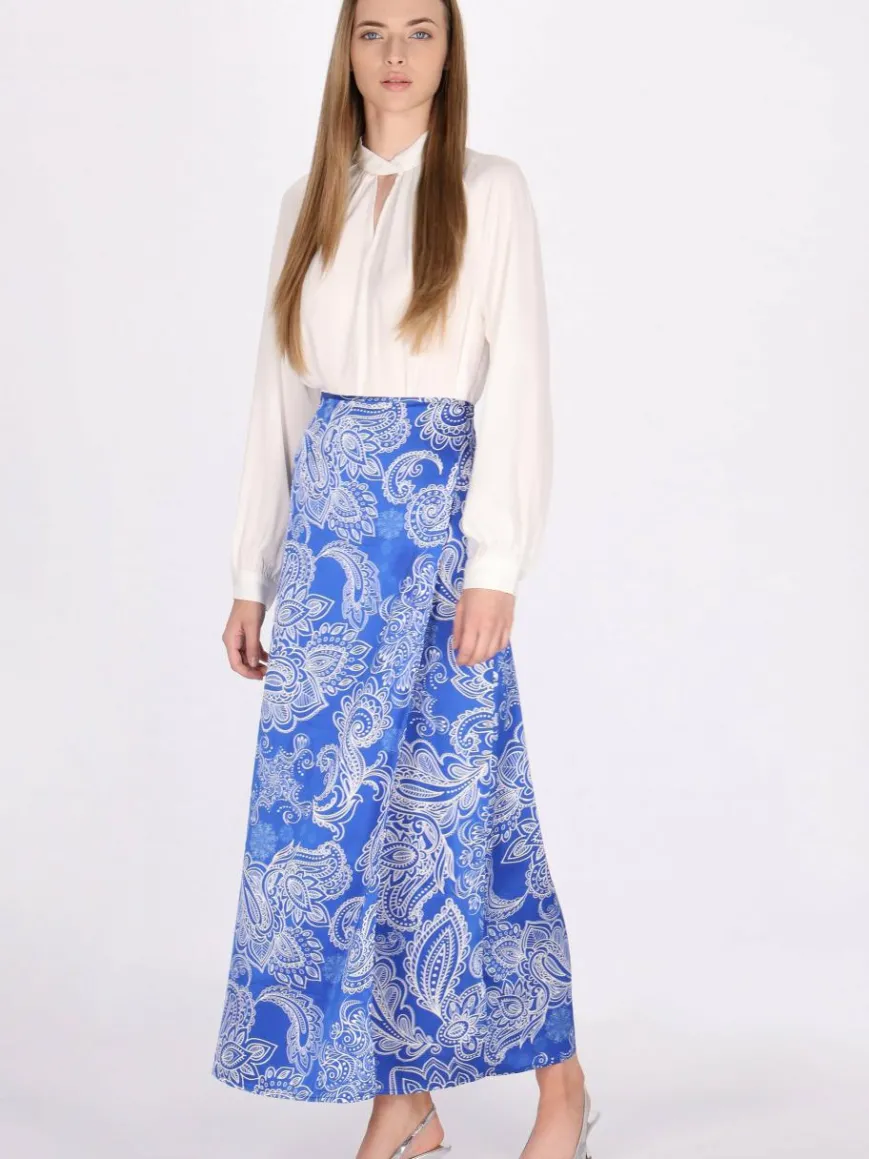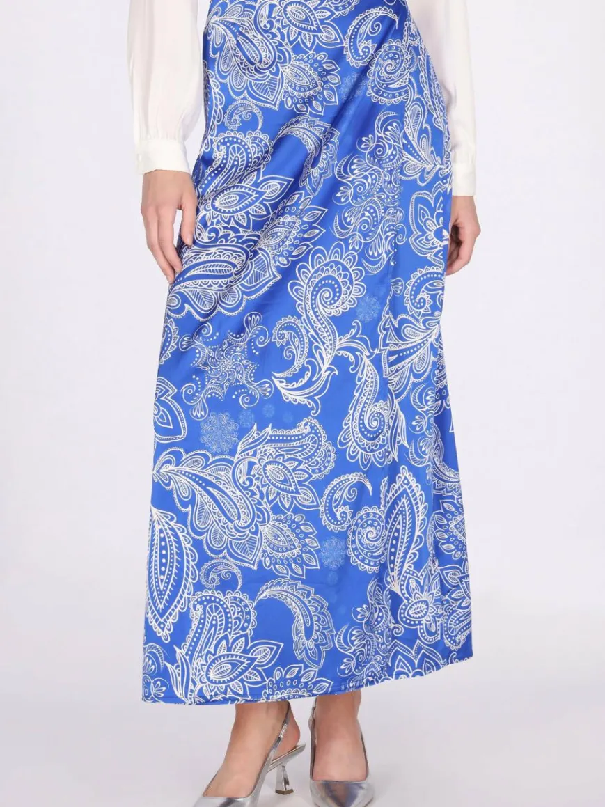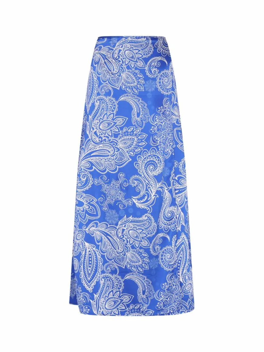 Hergestellt mit einer fließenden, locker sitzenden Silhouette präsentiert dieser Rock ein komplexes Paisley- oder blumenähnliches Muster. Seine glatte Textur und das leichte Gewebe sorgen für anmutiges Drapieren von der Taille bis zur Mitte der Wade oder Knöchellänge. Mit einem breiten Saum und verstecktem Verschluss für einen nahtlosen Look strahlt er Eleganz und Stil aus.