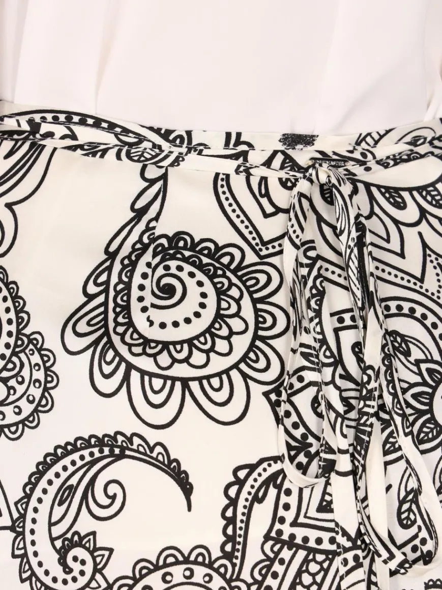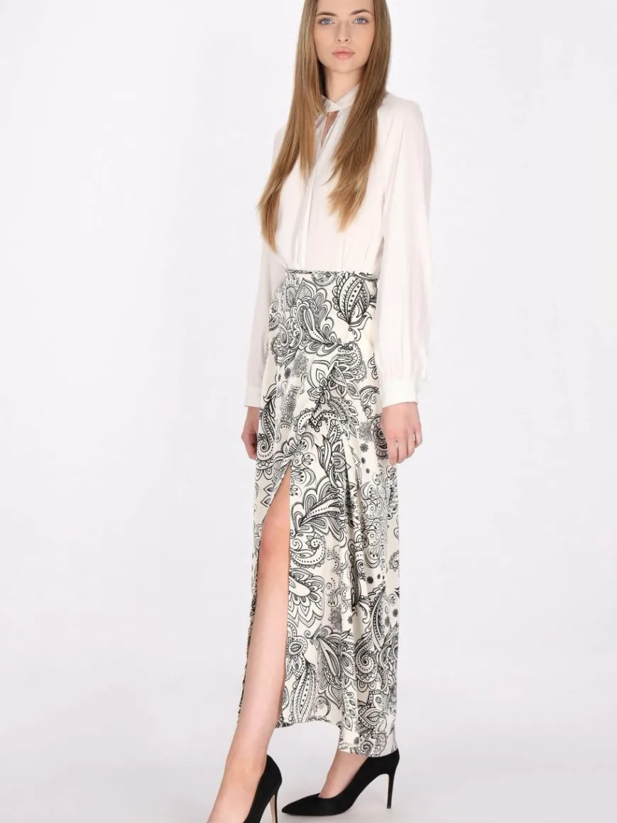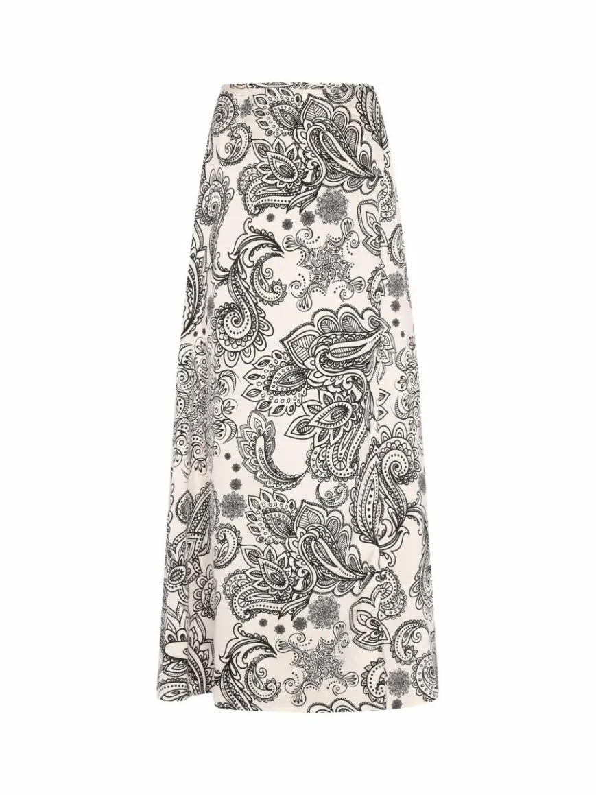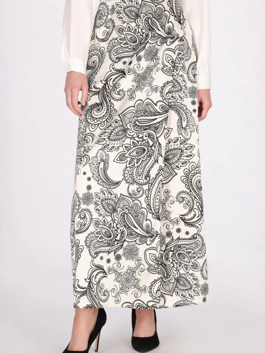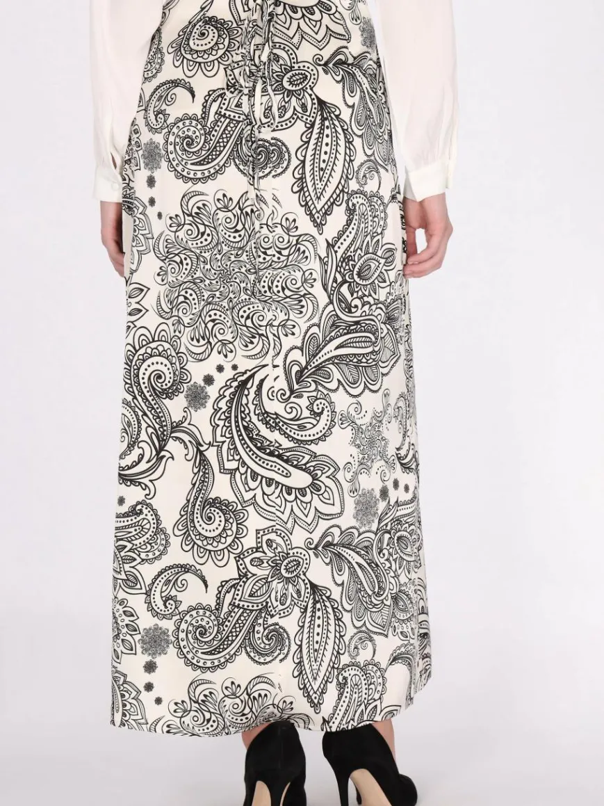 Hergestellt mit einer fließenden, locker sitzenden Silhouette präsentiert dieser Rock ein komplexes Paisley- oder blumenähnliches Muster. Seine glatte Textur und das leichte Gewebe sorgen für anmutiges Drapieren von der Taille bis zur Mitte der Wade oder Knöchellänge. Mit einem breiten Saum und verstecktem Verschluss für einen nahtlosen Look strahlt er Eleganz und Stil aus.