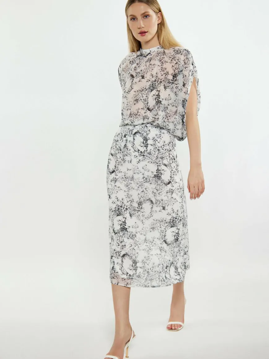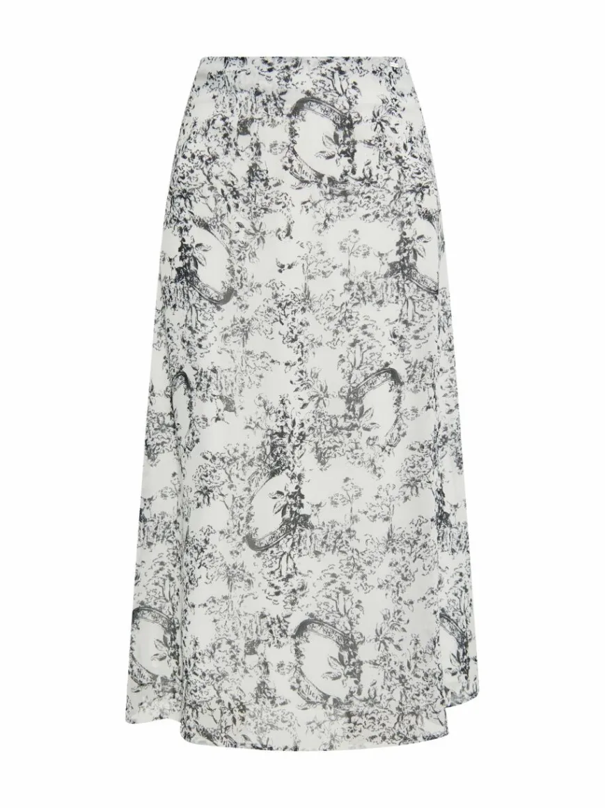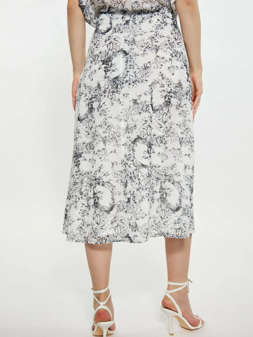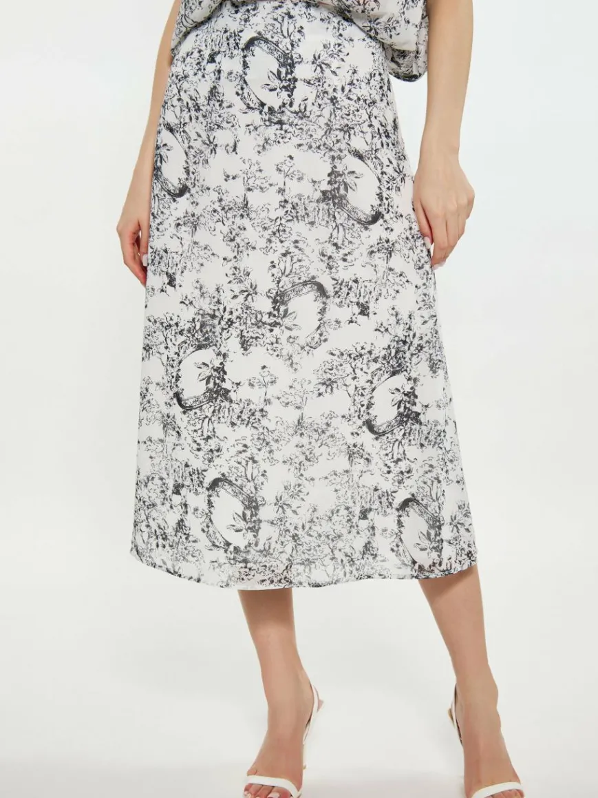 Discover an elegant midi skirt with a classic A-line. This elegant garment showcases intricate floral prints, creating a timeless and sophisticated look. A fitted waist and a slight flare at the hem make this skirt exude casual style.