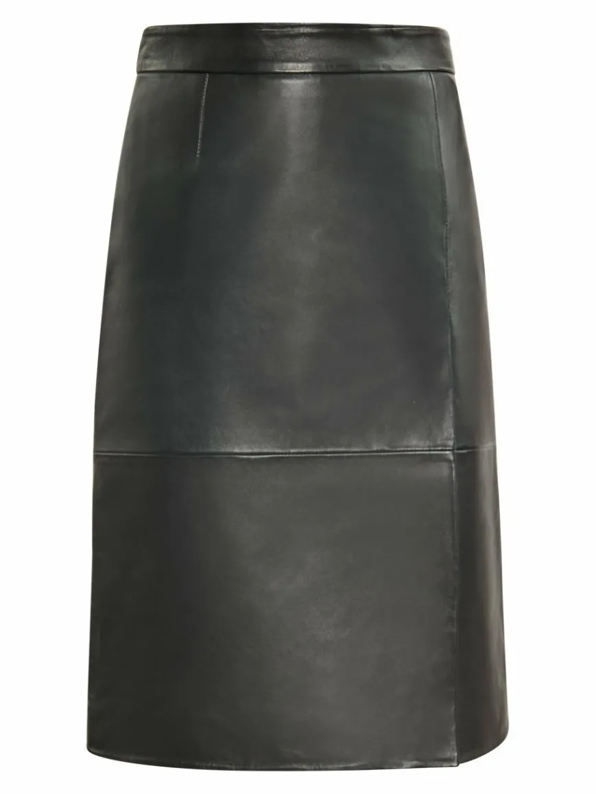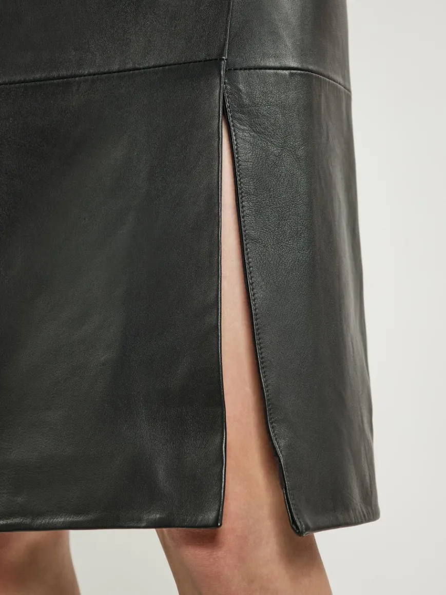 Elevate your style with this elegant midi skirt, showcasing a classic A-line silhouette. Crafted from luxurious lamb leather, it features a stylish slit for added flair and a hidden zipper for ease. The high waistband hugs the waist perfectly while flaring out gracefully at the hem, making it an ideal choice for any occasion.