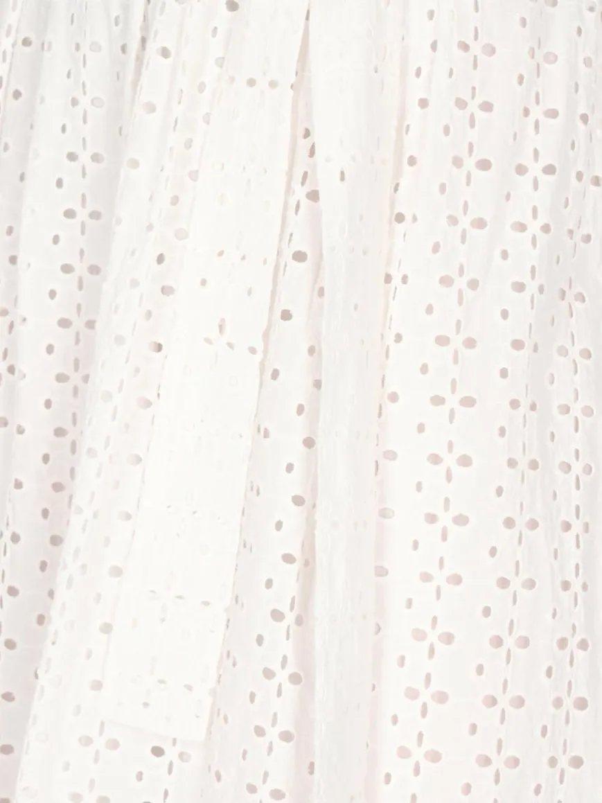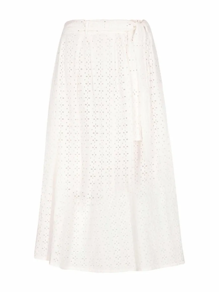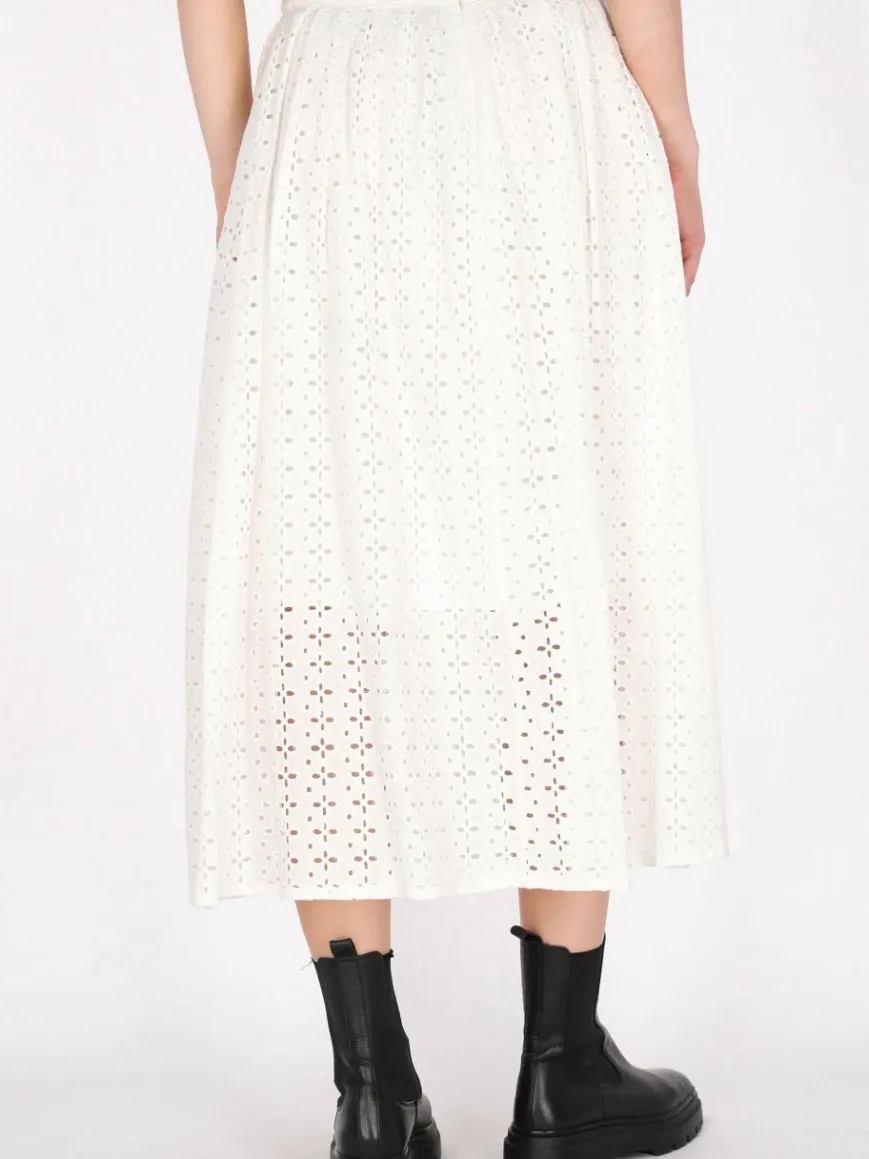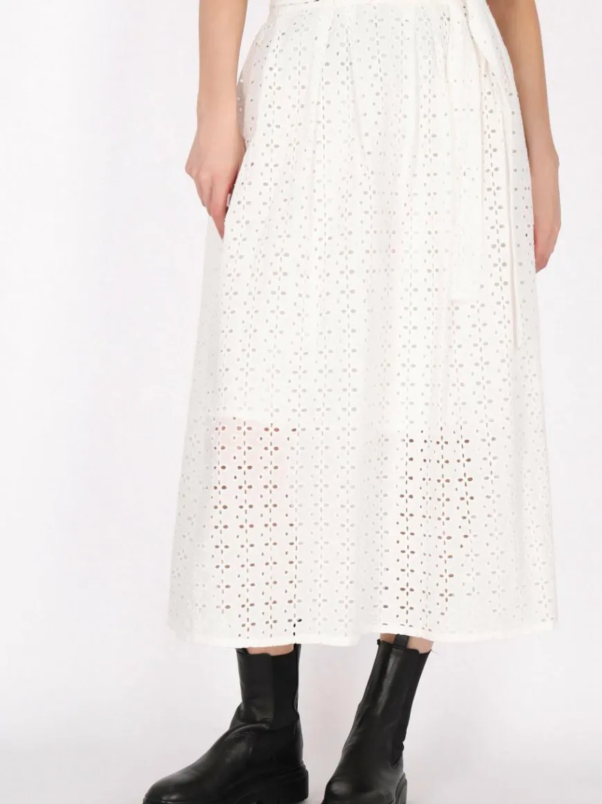 Accentuate your summer look with this high-waisted midi skirt with a stylish tie. Made of light cotton, translucent material on the lining, it has delicate openwork decorations that add texture. Gracefully reaching mid-calf, this elegant design has an A-line silhouette, perfect for casual outings.