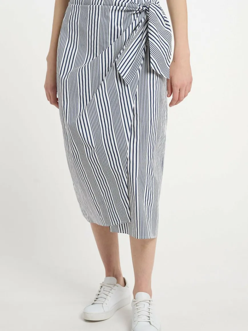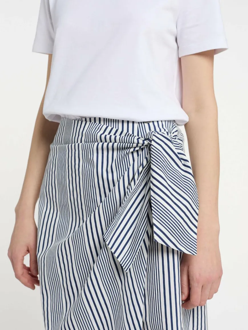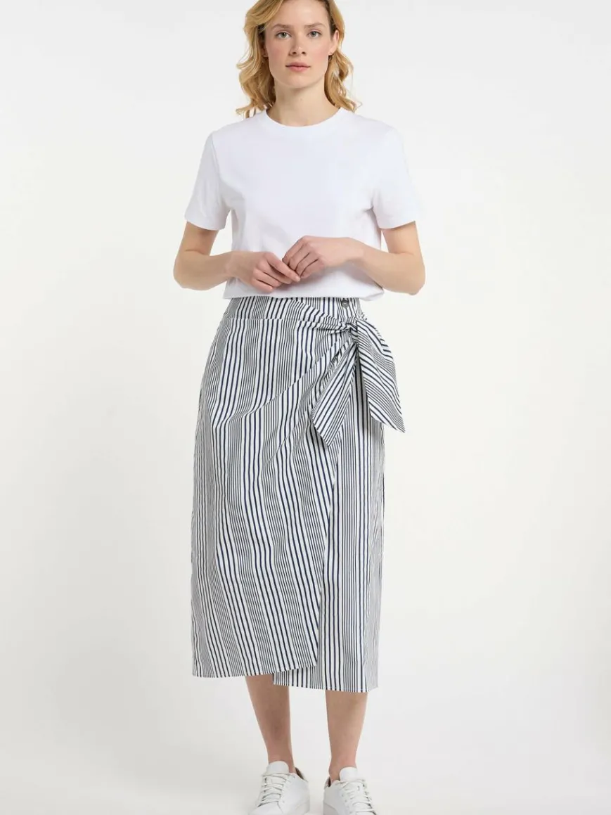 Der maritime Streifenlook, dazu eine raffinierte asymmetrische Silhouette mit Schleifendetail an der Taille und ein weiches Baumwollmaterial machen diesen wadenlangen Wickelrock von DreiMaster Maritim zum perfekten Sommerrock. Kombiniert mit T-Shirt, Sandalen oder Sneakern sitzen wir gedanklich unter Sonnenschirmen oder flanieren die Strandpromenade entlang.