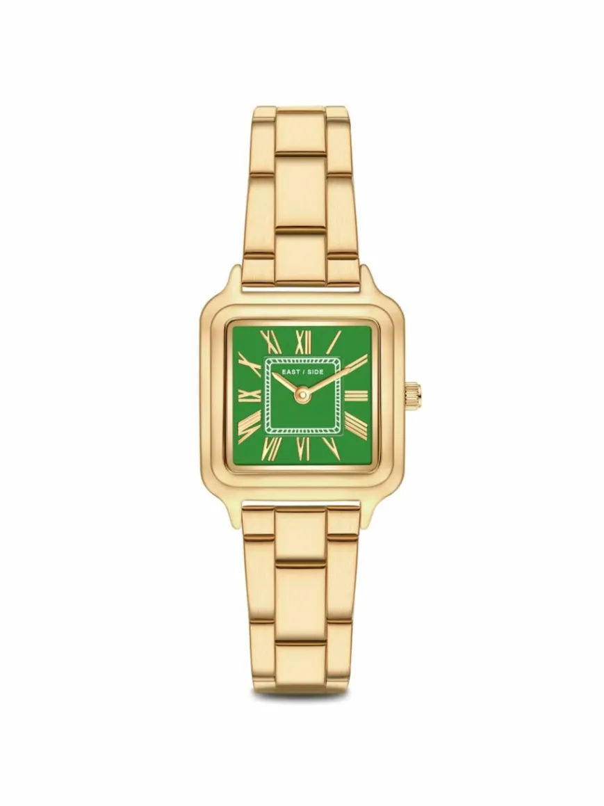 Gemacht für Liebhaberinnen exquisiter Uhrmacherkunst, ist dieses zeitlose Modell des jungen Labels EASTSIDE ein echtes Must-Have für jede Schmucksammlung. Der Look der markanten Damenuhr ist stilvoll-luxuriös und fokussiert auf die Zeitmesser-Funktion: Das dunkle Zifferblatt mit großen römischen Ziffern fügt sich perfekt in das eckige Gehäuse mit breiter Lünette ein, abgerundet durch dezente Stabzeiger.
