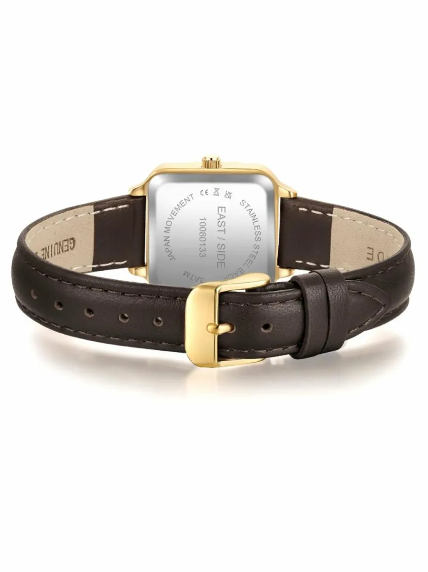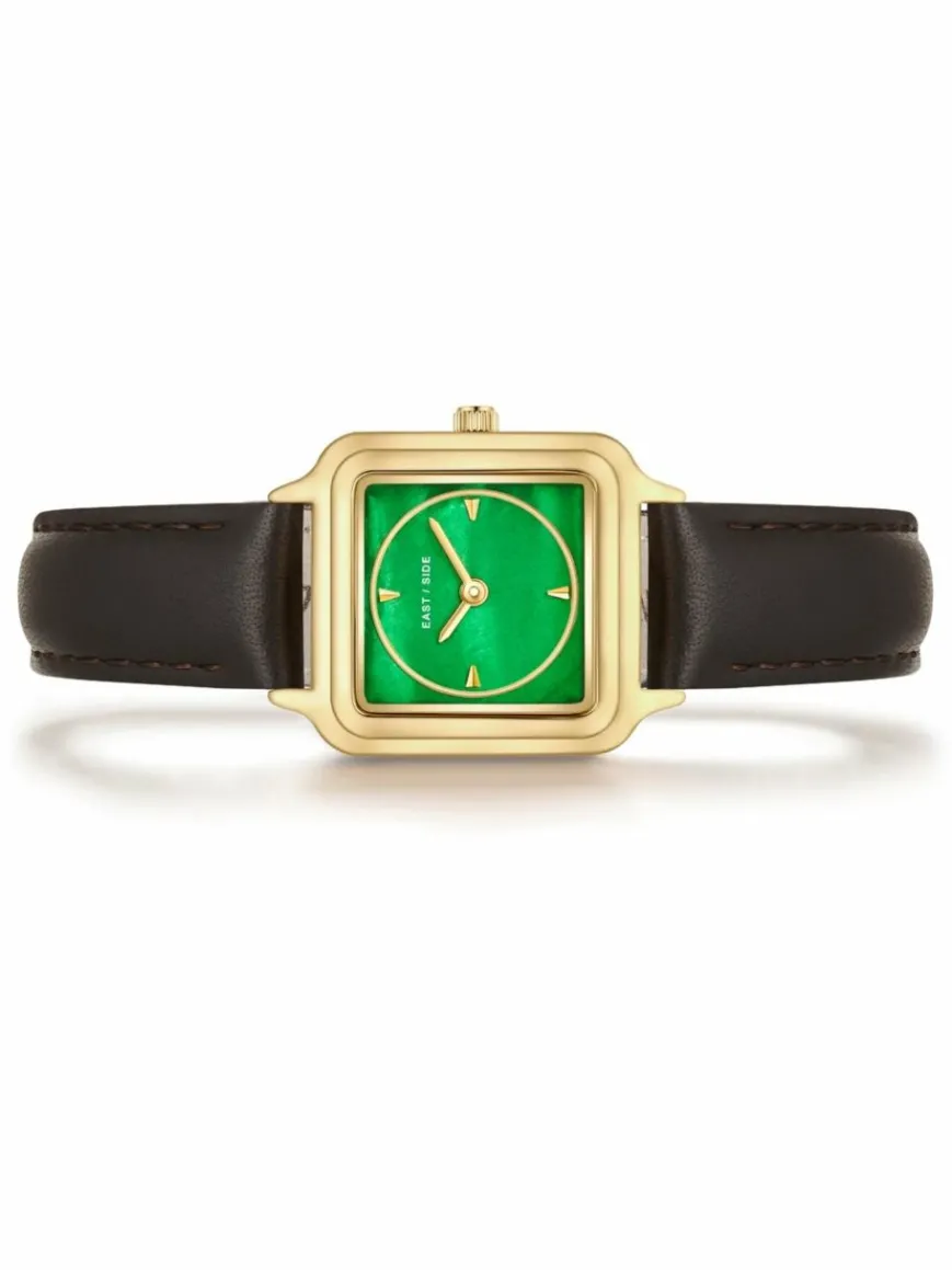 Dieses Uhrenmodell des jungen Labels EASTSIDE wurde entworfen für Frauen, die ihren Style mit Unterstatement-Accessoires unterstreichen möchten. Inspiriert vom schillernden Glanz zeitloser Uhrenikonen, verbindet die Uhr klassisches Zeitmesser-Design mit einem modernen Materialkonzept. Ein eckiges Gehäuse mit markanter Lünette bildet den Rahmen für ein kontrastierenden Zifferblatt aus schimmerndem Perlmutt. Dezente Strichindizes und schlanke Stabzeiger bieten dem Auge Orientierung.