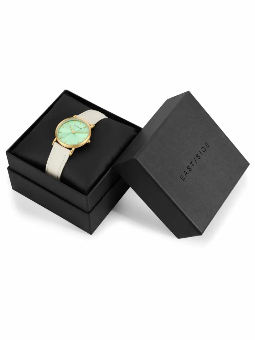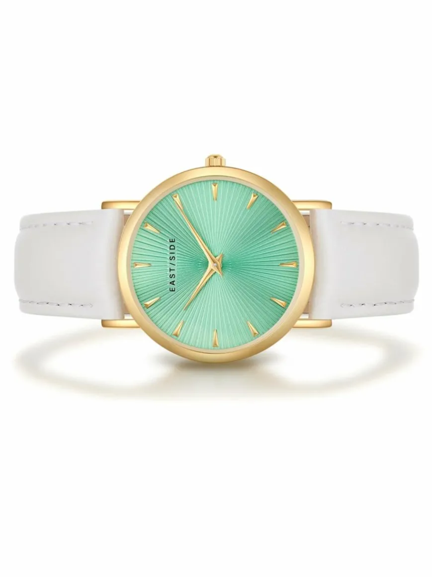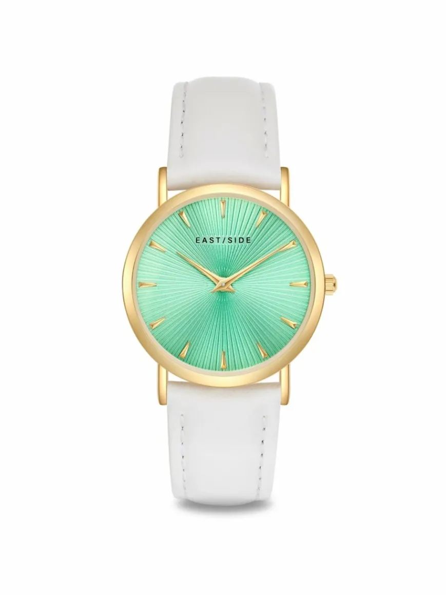 Sie suchen eine Damenuhr, die die Vorzüge alter Uhrmacherkunst mit modernen Vibes vereint? Dann ist dieses außergewöhnliche Modell des jungen Labels EASTSIDE der passende Eyecatcher am Handgelenk: Das runde Gehäuse mit Plattierung in Gelbgold umrahmt ein aufgeräumtes Zifferblatt, das raffiniert mit den Lichtreflexen eines Sunray-Schliffs spielt, ansonsten aber auf minimalistisches Understatement setzt. Schlichte Strichindizes und edle Dauphinzeiger runden den Look harmonisch ab.