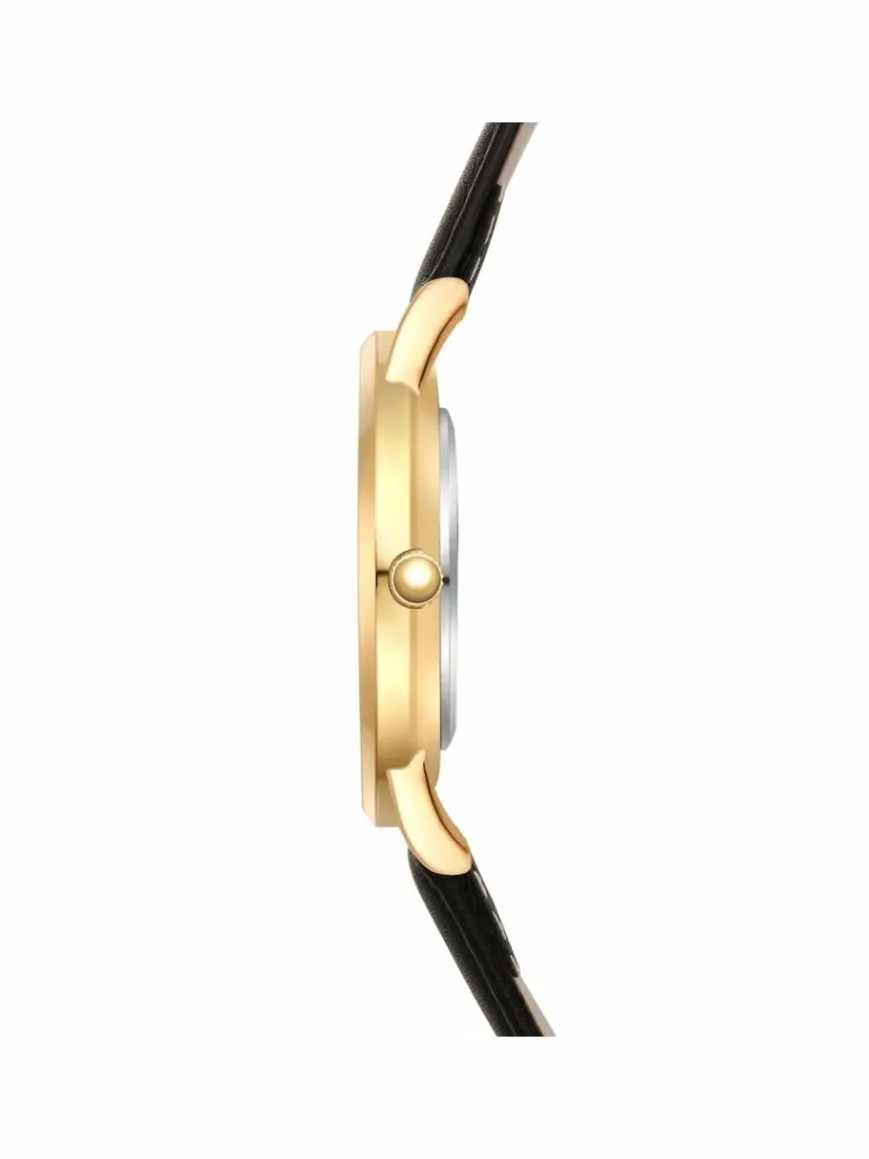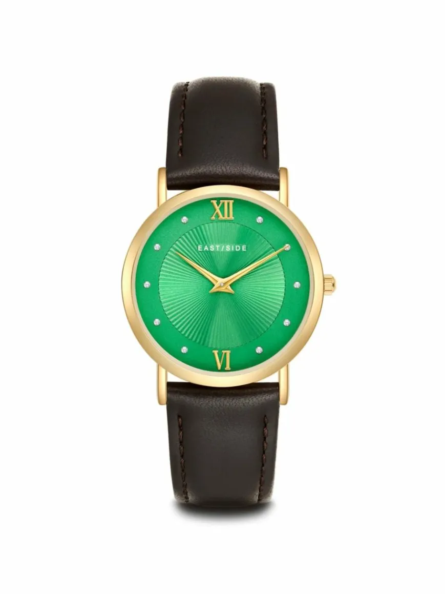 Sie mögen Uhren, die klassische Horlogerie-Werte mit modernen Vibes vereinen? Dann ist dieses Damenmodell des jungen Labels EASTSIDE der neue Star in Ihrer Uhrensammlung. Das runde Gehäuse mit Plattierung in Gelbgold bildet den edlen Rahmen für ein Sonnenschliff-Zifferblatt, das gekonnt mit Lichtreflektionen spielt, ansonsten aber bewusst auf Understatement setzt. Dezente Zifferblattmarkierungen und Dauphinzeiger zahlen perfekt auf diesen Stil ein.