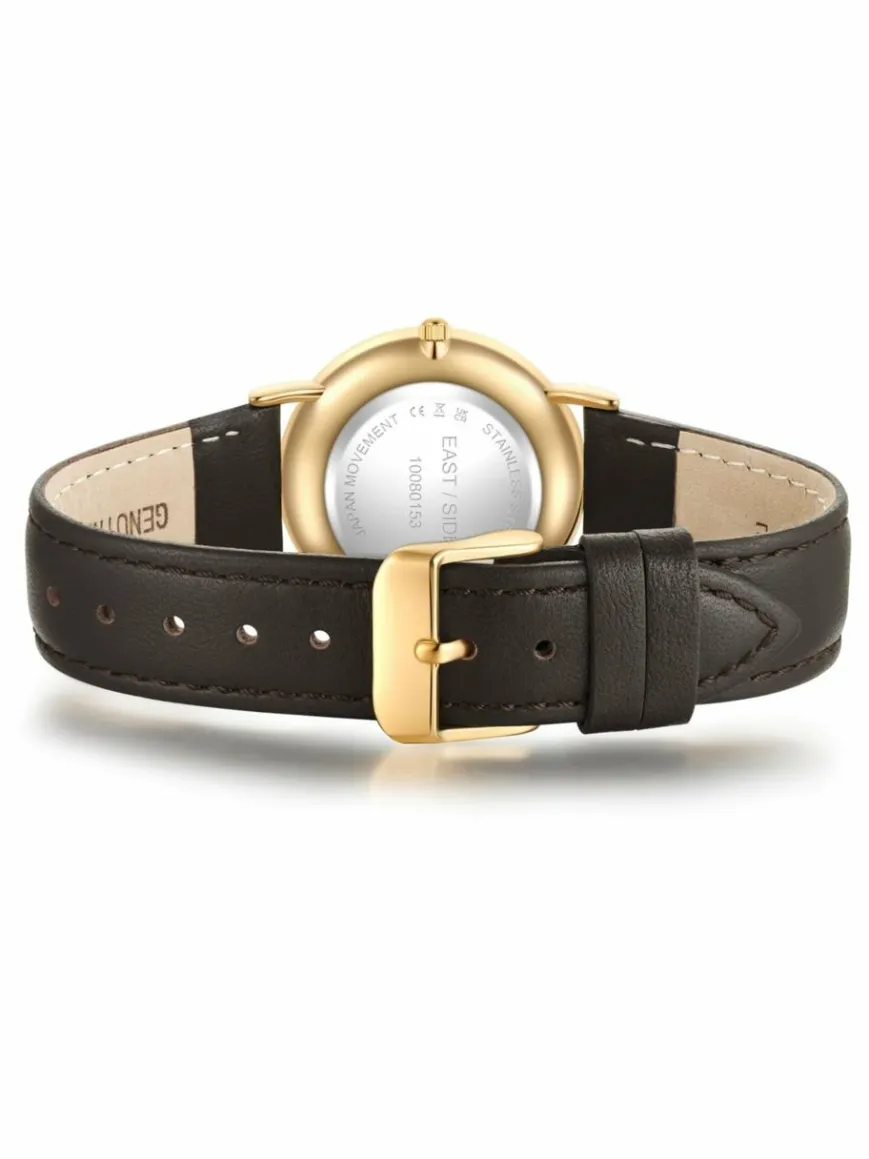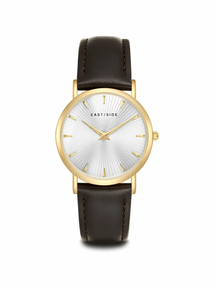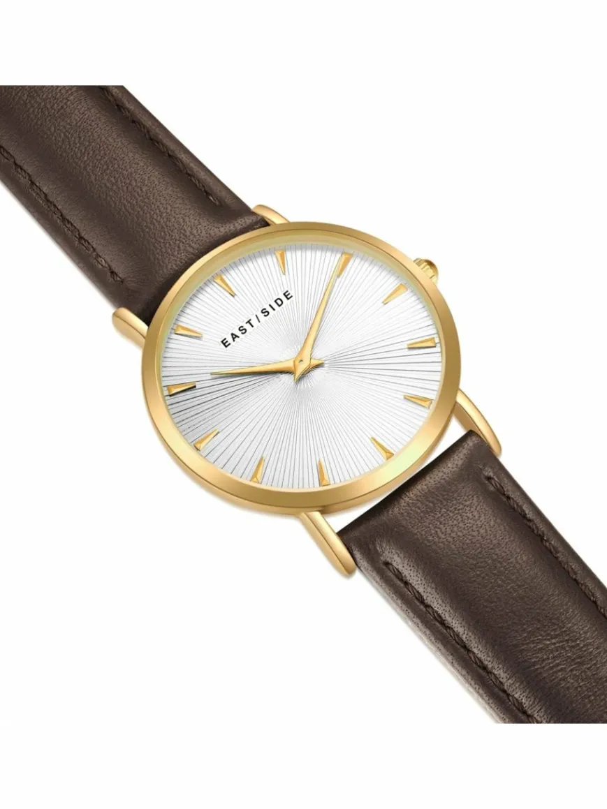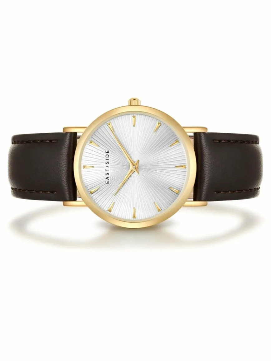 Sie wünschen sich eine edle Damenuhr, die den hohen Anspruch traditioneller Uhrmacherkunst mit zeitgemäßen Materialien verbindet? Dann ist dieser exquisite Zeitmesser des jungen Labels EASTSIDE wie für Sie gemacht und versprüht Luxus-Vibes am Handgelenk: Das runde Gehäuse mit IP-Veredelung in Gelbgold umrahmt ein Zifferblatt, dessen Sonnenschliff raffiniert mit dem Licht spielt, ansonsten aber auf Minimalismus setzt.