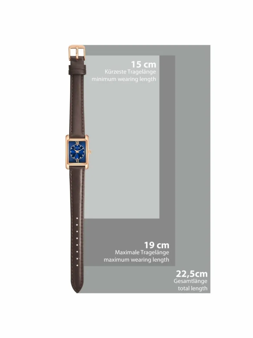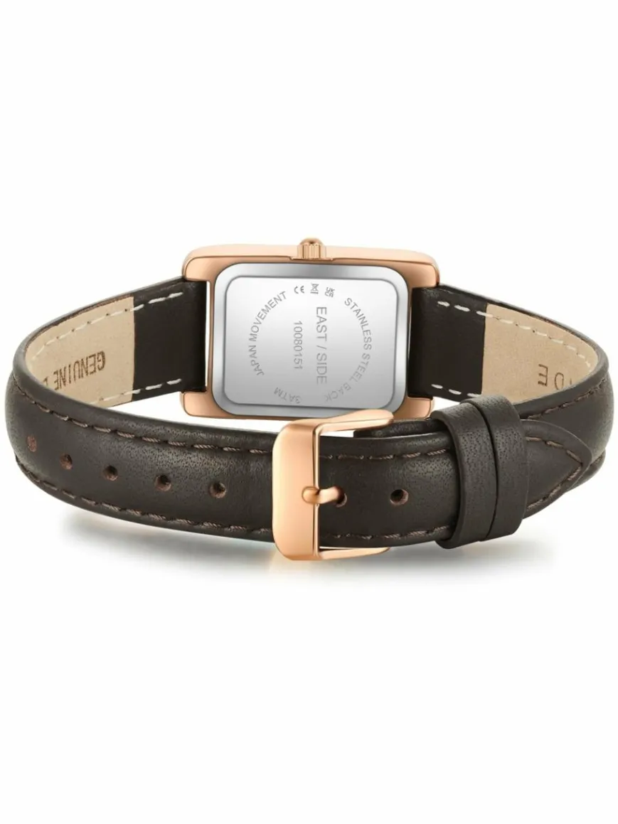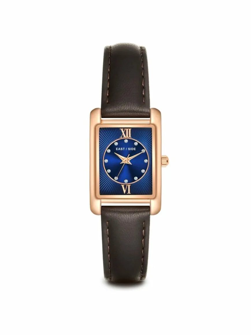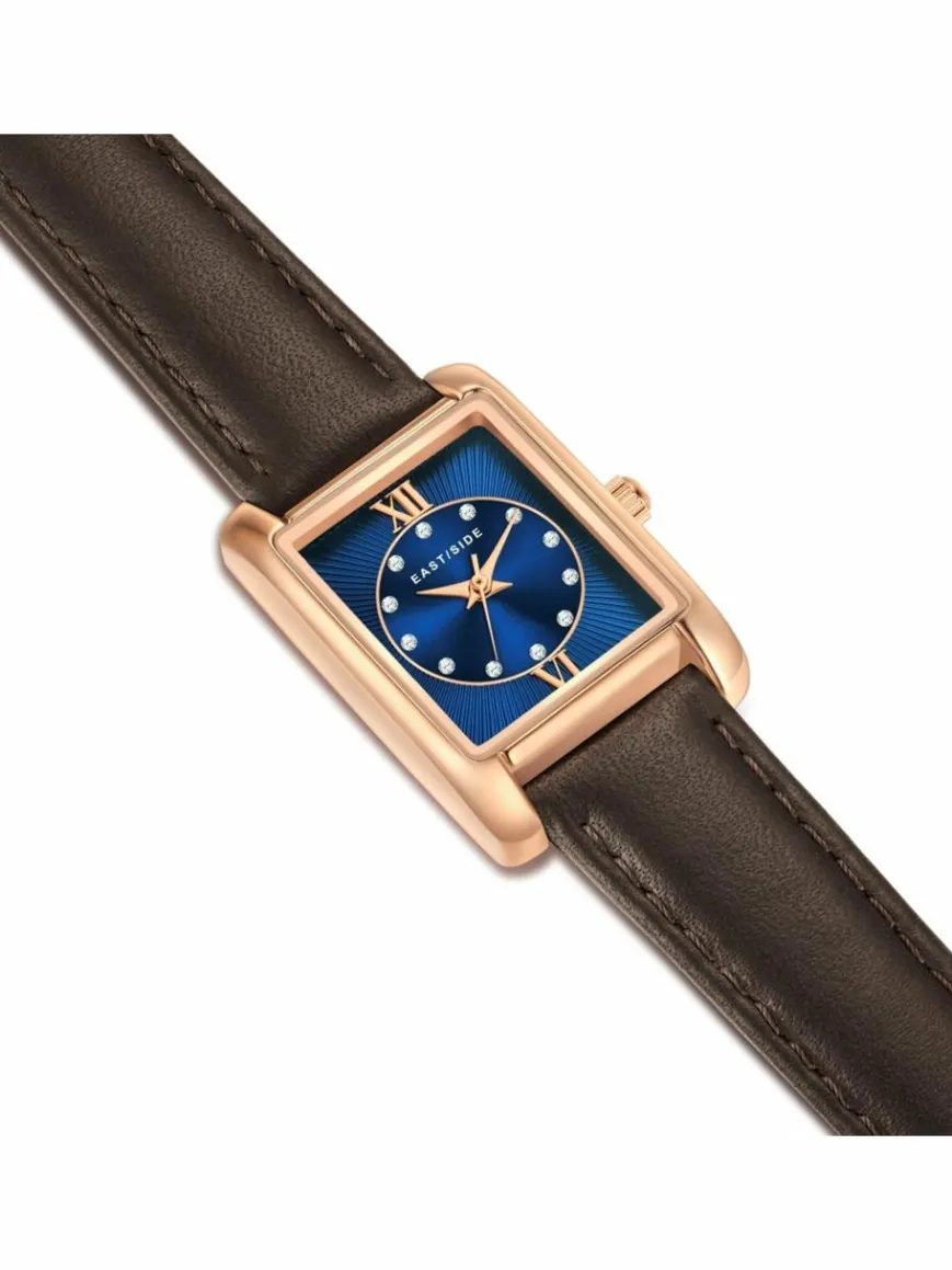 Sie suchen einen Zeitmesser, der Luxus-Vibes mit bewährter Horlogerie-Tradition und modernen Materialien vereint? Dann ist diese markante Damenuhr des jungen Labels EASTSIDE Ihr neuer Begleiter. Das rechteckige Gehäuse mit Plattierung in Roségold umrahmt ein dunkles Zifferblatt, das mit den raffinierten Lichtreflexen eines partiellen Sunray-Schliffs spielt, sich ansonsten aber auf schlichte Zifferblattmarkierungen und edle Dauphinzeiger reduziert.