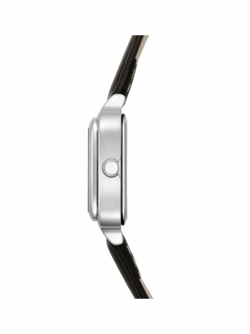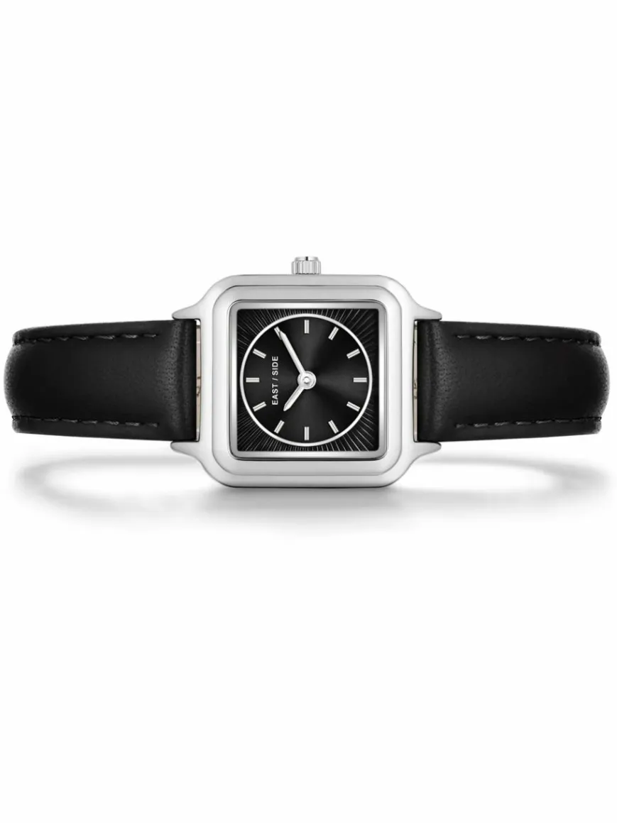 Dieser exquisite Zeitmesser des jungen Labels EASTSIDE ist ein It-Piece für Frauen, die klassisch inspirierten Schmuck mögen. Das Design verbindet die Werte traditioneller Horlogerie und Zeitgeist in Perfektion: Ein markant-eckiges Gehäuse in strahlend-kühlem Silber bildet den Rahmen für ein dunkles Zifferblatt mit luxuriösen Sunray-Effekten. Minimalistisch eingesetzte Strichindizes, schlanke Stabzeiger und eine breite Lünette runden das aufgeräumte Zifferblatt ab.