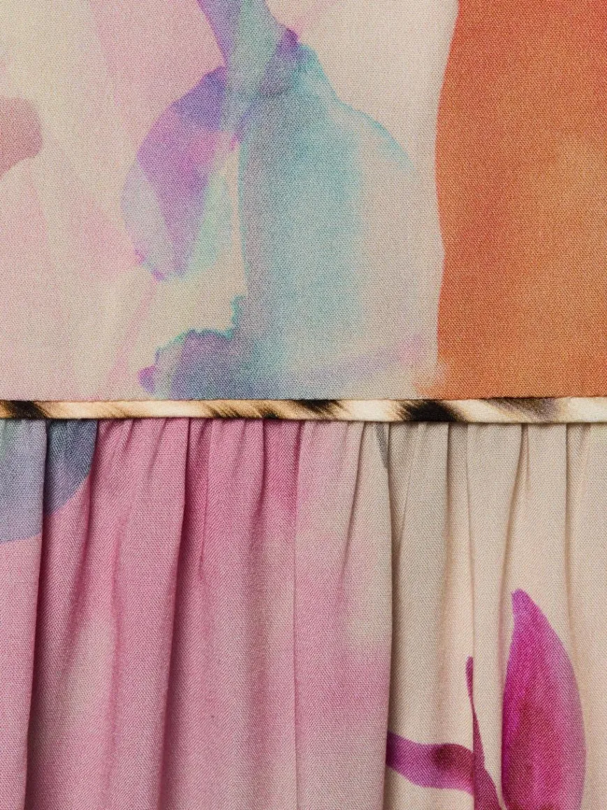 Die Viskosebluse von Emily van den Bergh begeistert im Wasserfarben-Design mit coolen Kontrastdetails und verleiht dem Look nonchalant ein künstlerisches Finish.