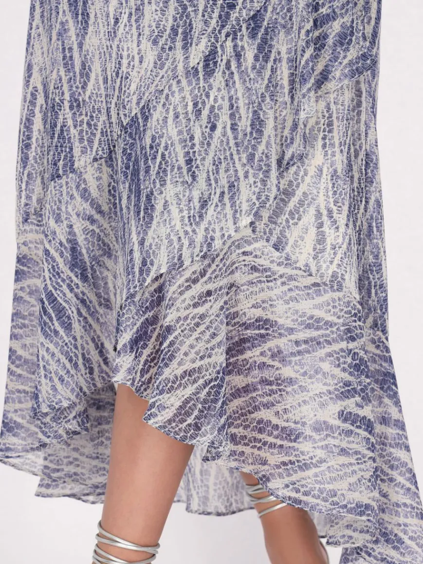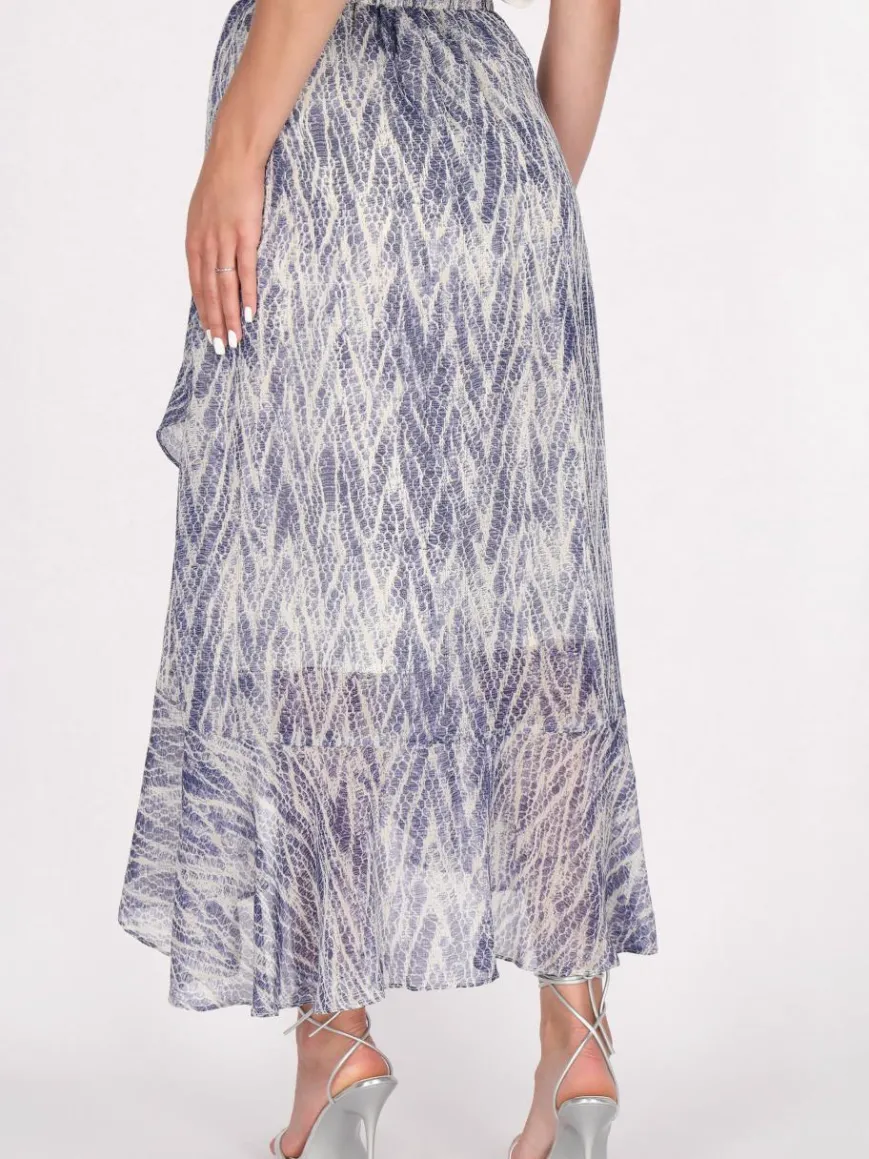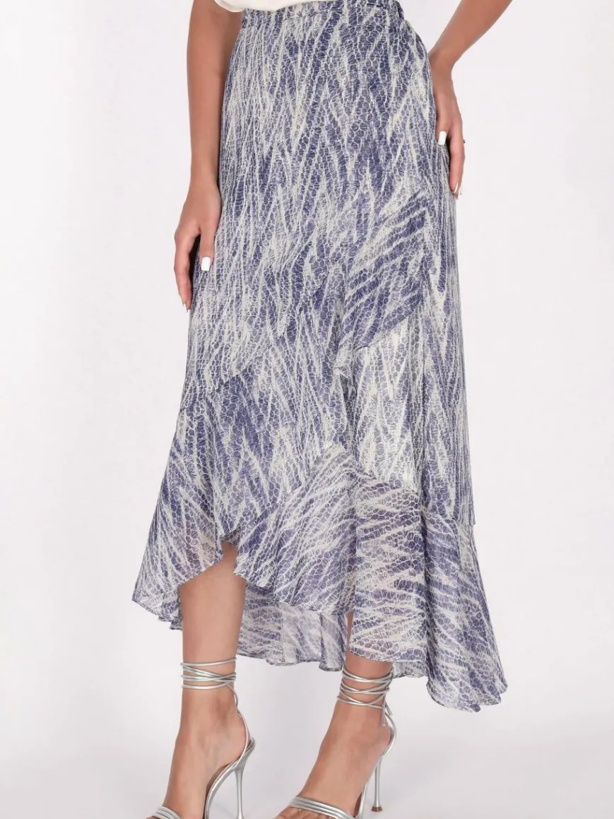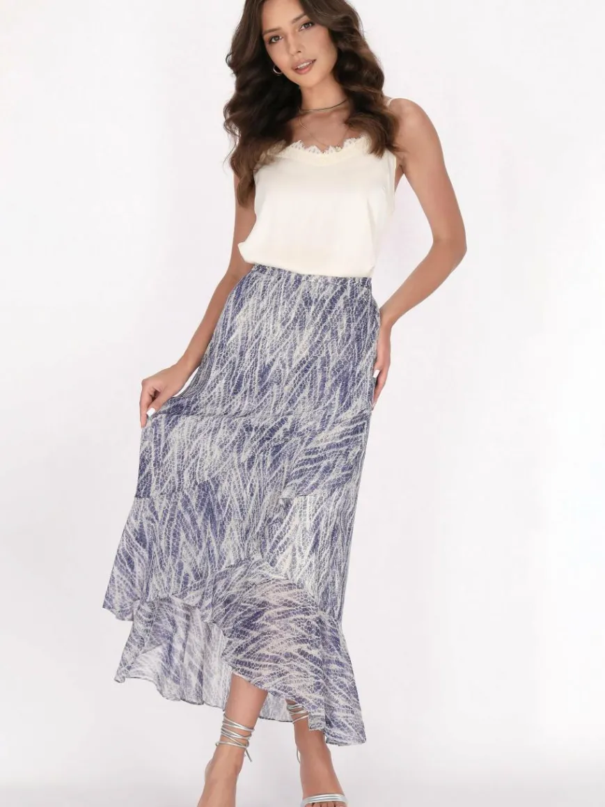 Heben Sie Ihre Garderobe mit diesem hoch taillierten Rock auf, der ein einzigartiges Muster präsentiert, das die Schönheit natürlicher Texturen nachahmt. Der A-Linien-Schnitt fließt elegant aus der Taille heraus und schafft eine schmeichelhafte Silhouette, die sich zum Saum hin verbreitert. Ein asymmetrischer Saum verleiht einen Hauch von Dynamik, mit einem kürzeren Vorderteil und einem längeren Rückenteil für einen fließenden Look.