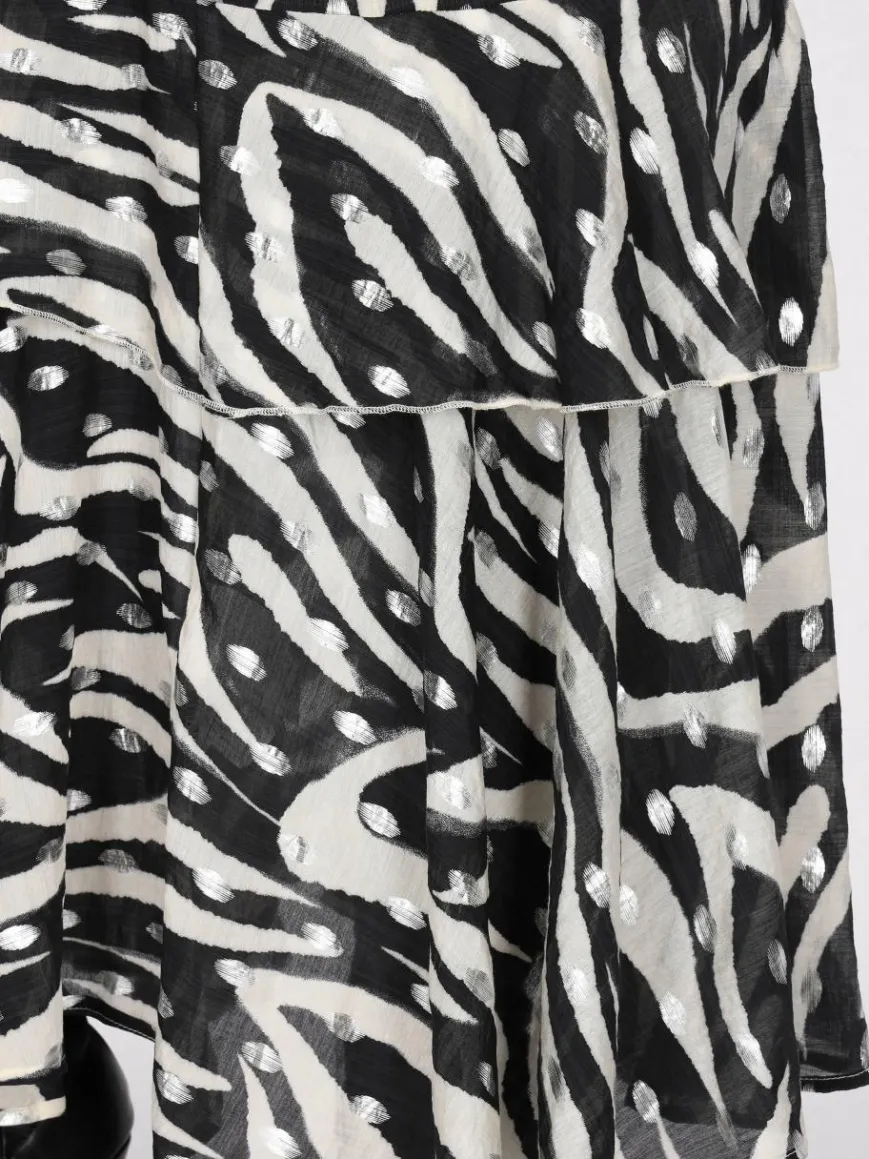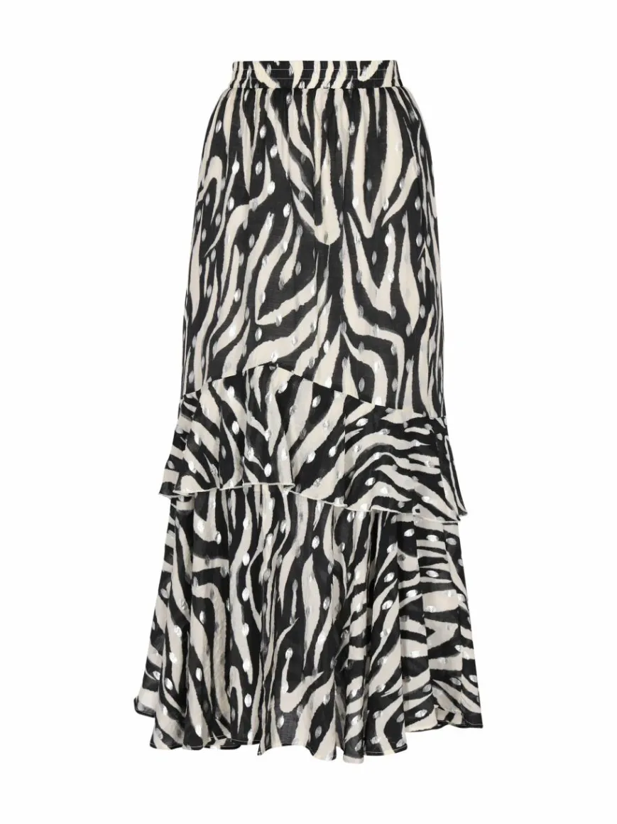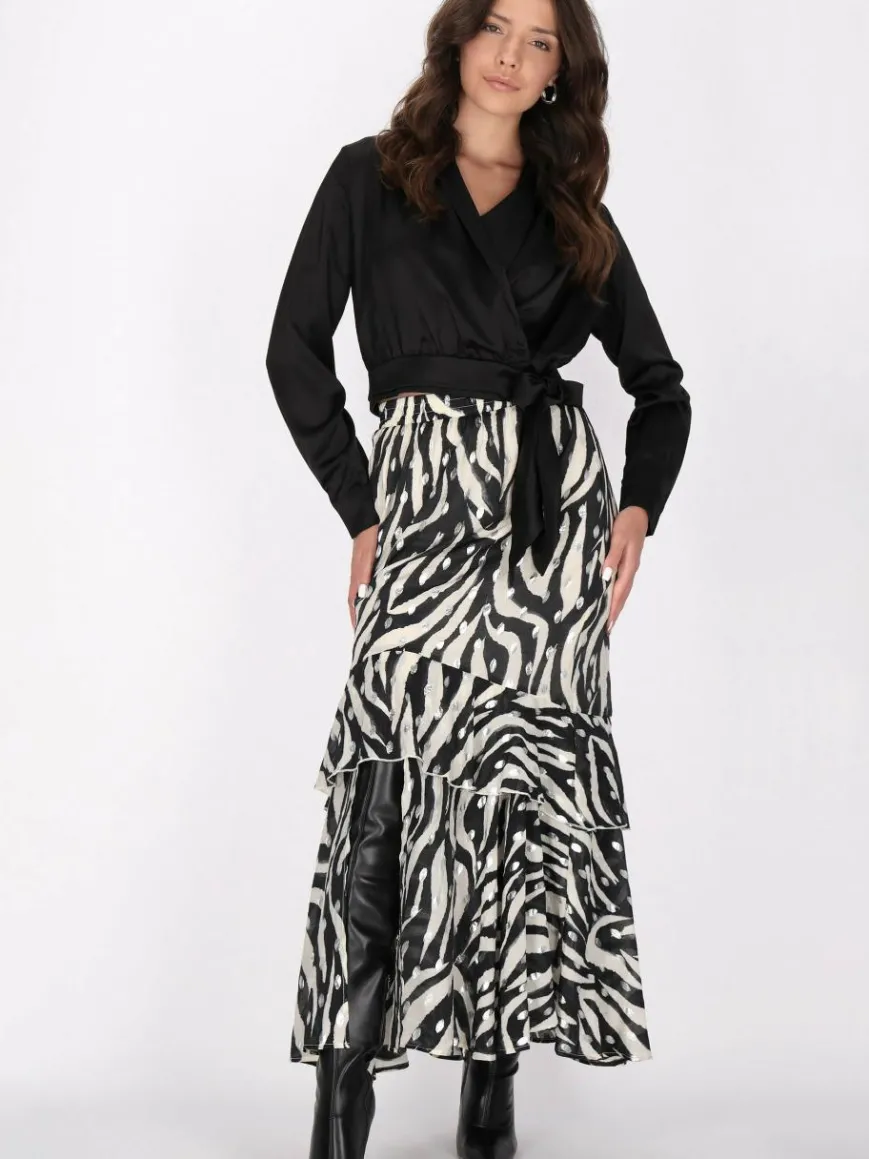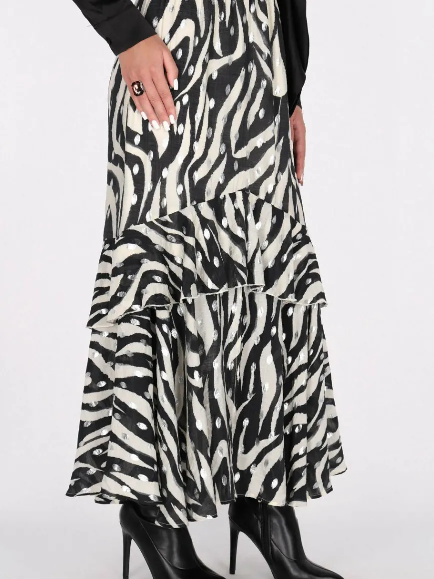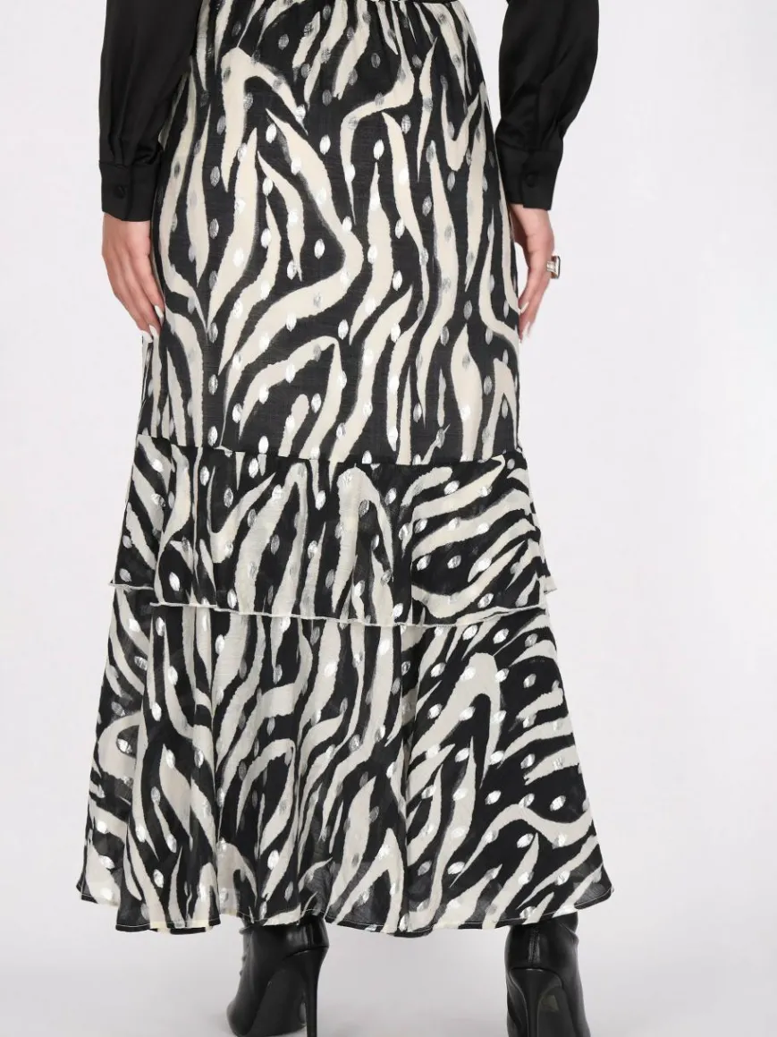Umarme die wilde Seite mit diesem Rock, der ein auffälliges Tiermuster zeigt. Sein gestufter Schnitt mit verspielten Rüschen schafft eine voluminöse Silhouette, während der elastische Bund für Komfort und einfaches Anziehen sorgt. Der leichte, fließende Stoff ermöglicht anmutige Bewegungen und schönes Drapieren beim Tragen. Der ungleiche Saum verleiht diesem schwungvollen Stück eine dynamische Note, perfekt für diejenigen, die gerne mit ihrem Stil auffallen möchten.