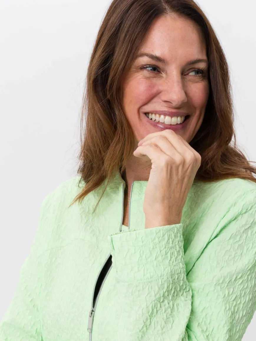 Die Jacke zeichnet sich durch einen runden Stehkragen und eine durchgehende Frontreißverschlussöffnung aus. Der strukturierte Stoff sorgt für einen besonderen Look. Zwei praktische Taschen runden das Design ab. Perfekt für vielseitige Kombinationen