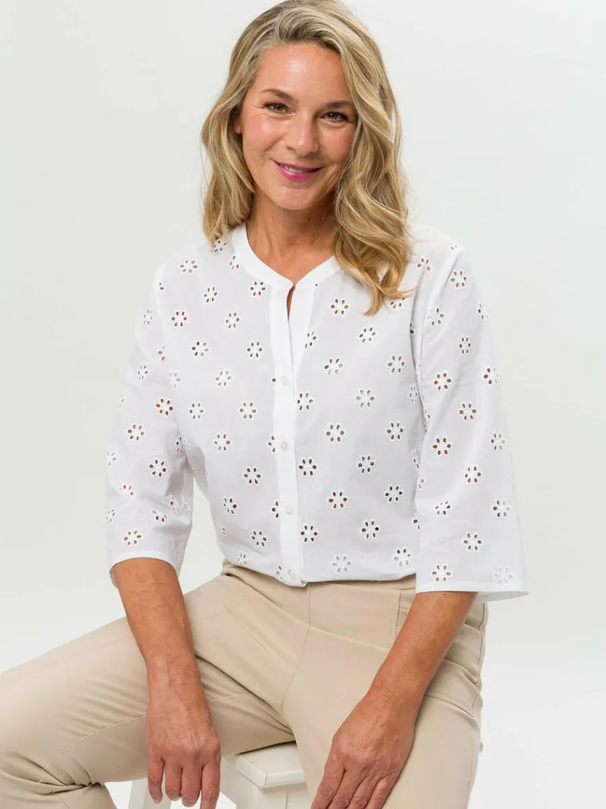 Zarte Lochspitzenbluse aus reiner Baumwolle, die nur ganz wenig Haut durchscheinen lässt. Zauberhaft verarbeitet trägt sie sich wunderbar leicht und angenehm. Feminin gestalteter Rundhalsausschnitt, schmale Knopflesite und 3/4 Armlänge.