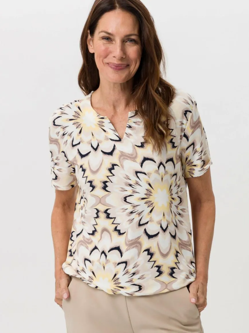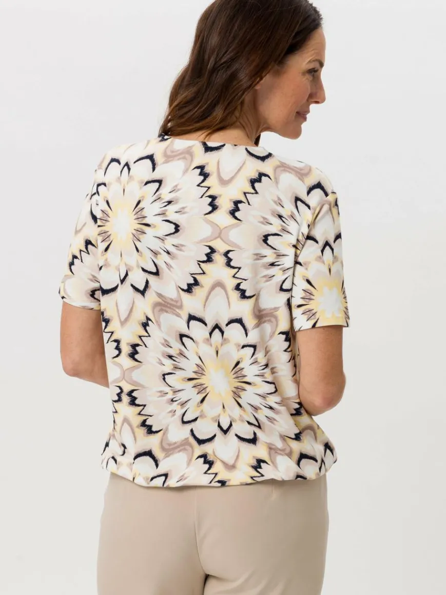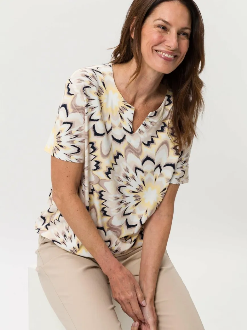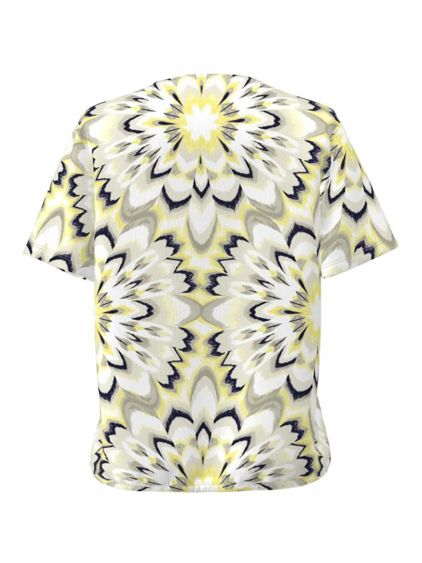 Dieses Kurzarmshirt beeindruckt mit einem auffälligen, symmetrischen Muster und einem bequemen Schnitt. Das leichte, fließende Material sorgt für angenehmen Tragekomfort und macht es ideal für stilvolle Alltags- und Freizeitlooks. Ein echter Hingucker!