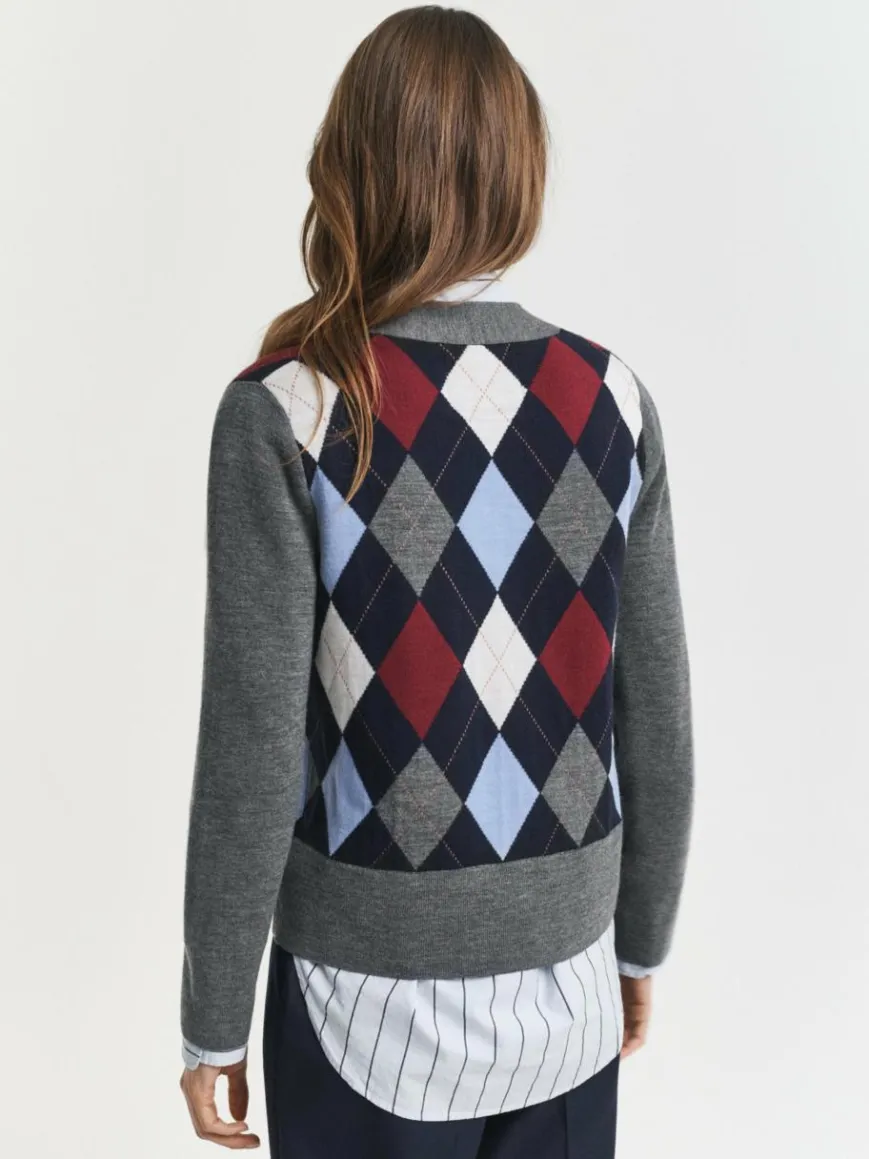 Die GANT Strickjacke aus weicher Merinowolle mit klassischem Argyle-Muster schenkt jedem Outfit einen Hauch College-Chic.