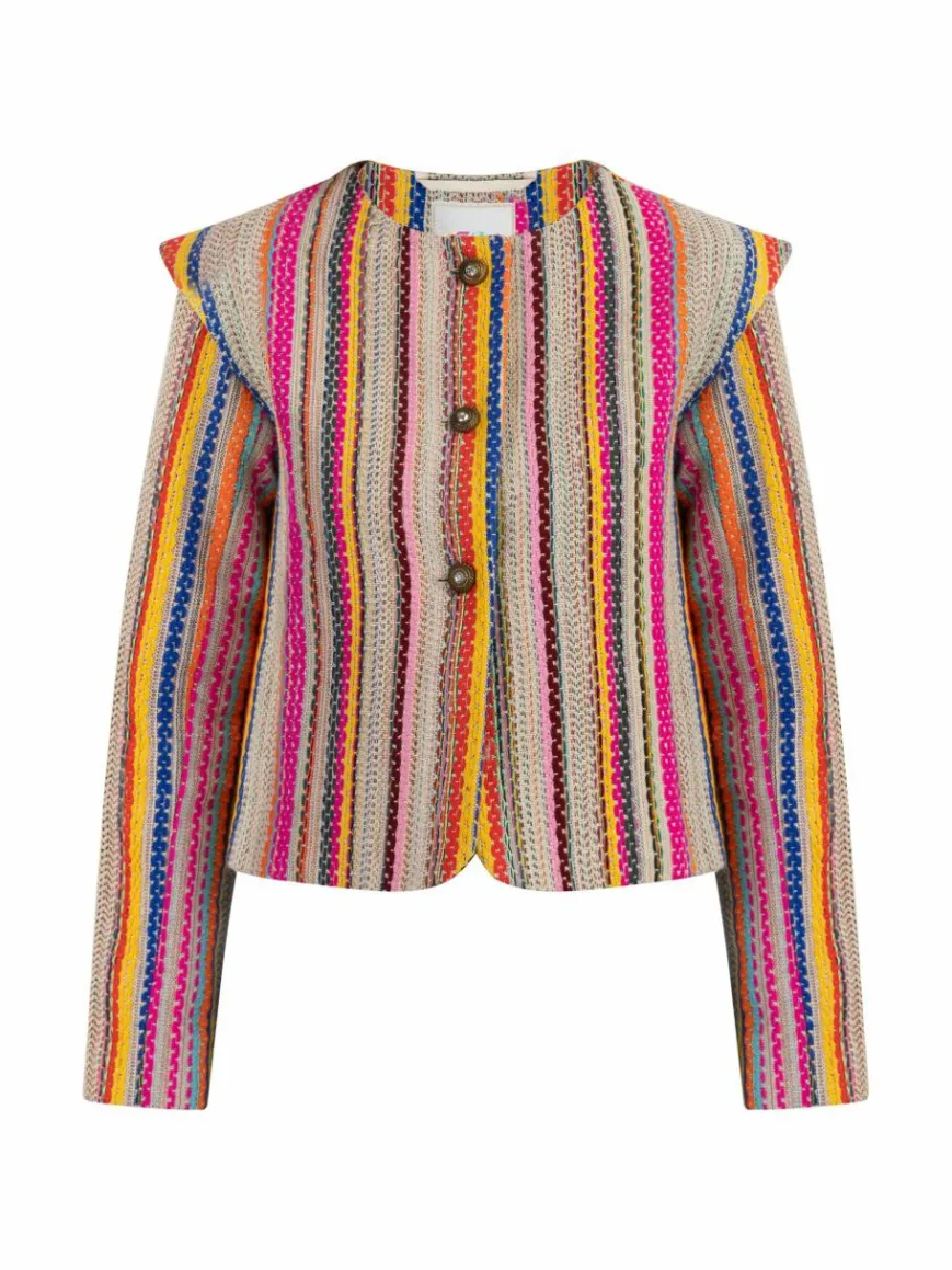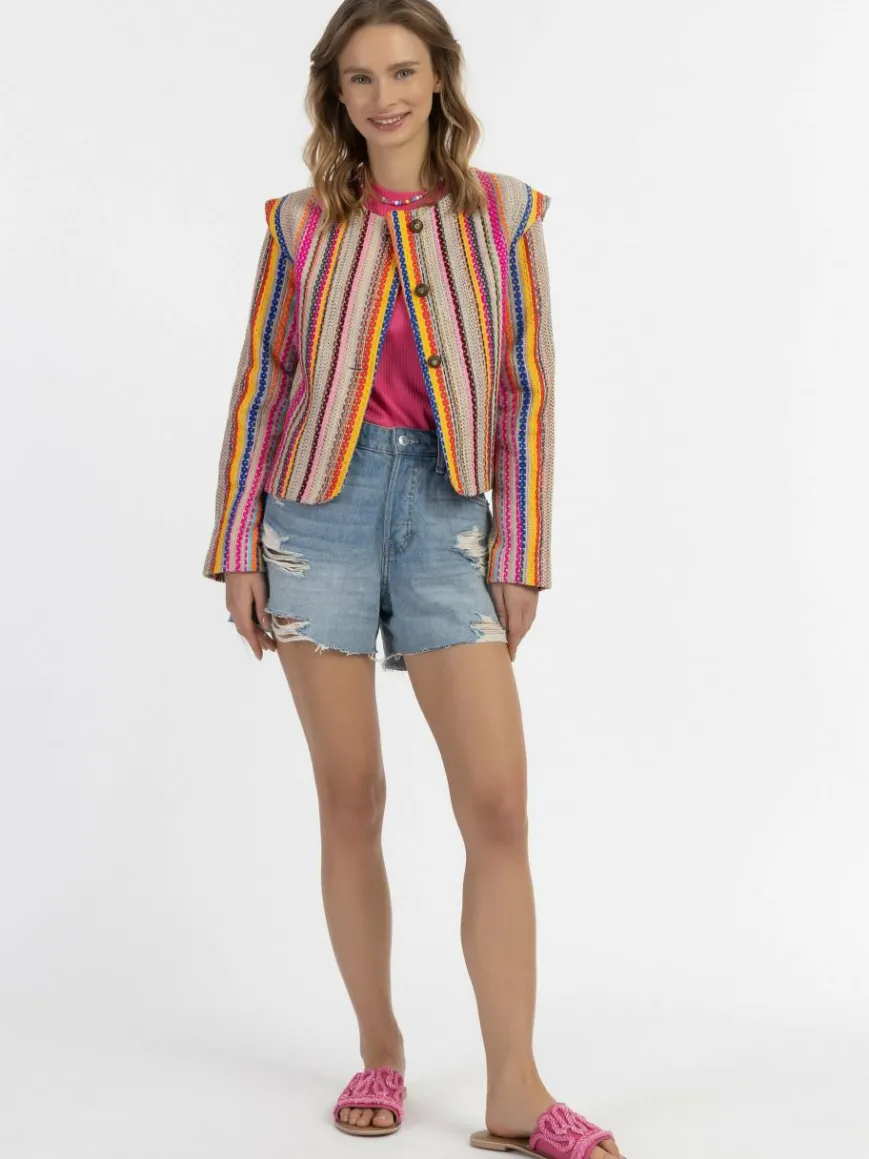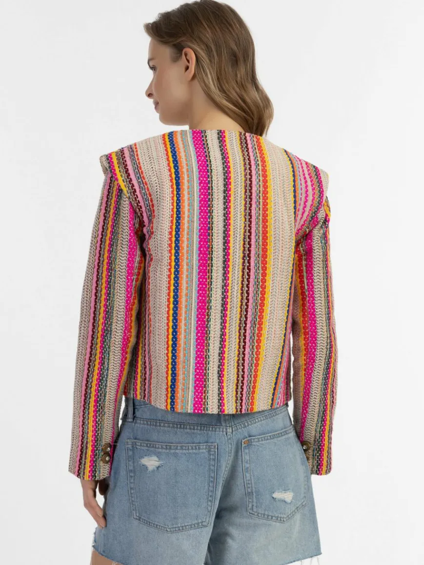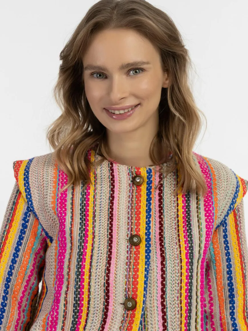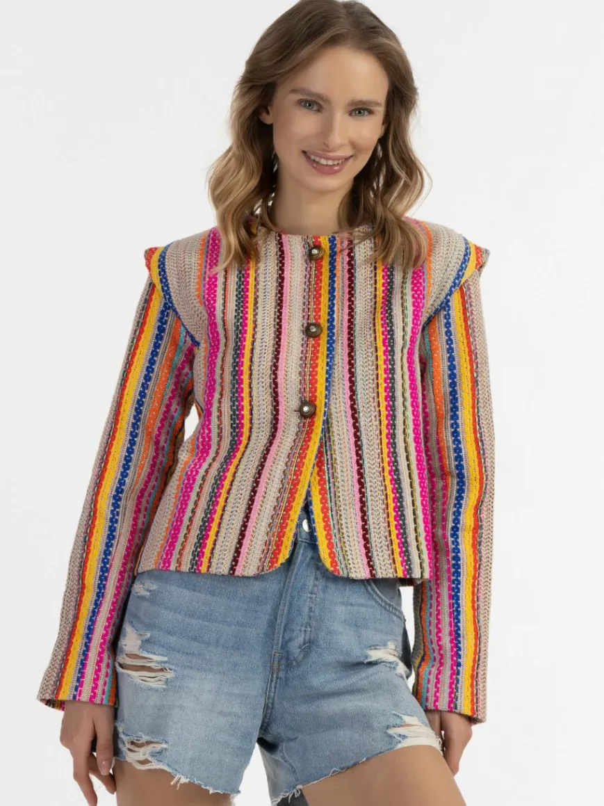 In typischer IZIA-Manier designt, begeistert uns die bunt gewebte Jacke im Ehno-Look. Gefertigt aus einem weichen Baumwollgemisch setzen Streifen und Muster die Hauptakzente. Abgerundet wird das lässige Boho-Piece durch das besondere Schulterdesign und durch die verzierten Knöpfe.