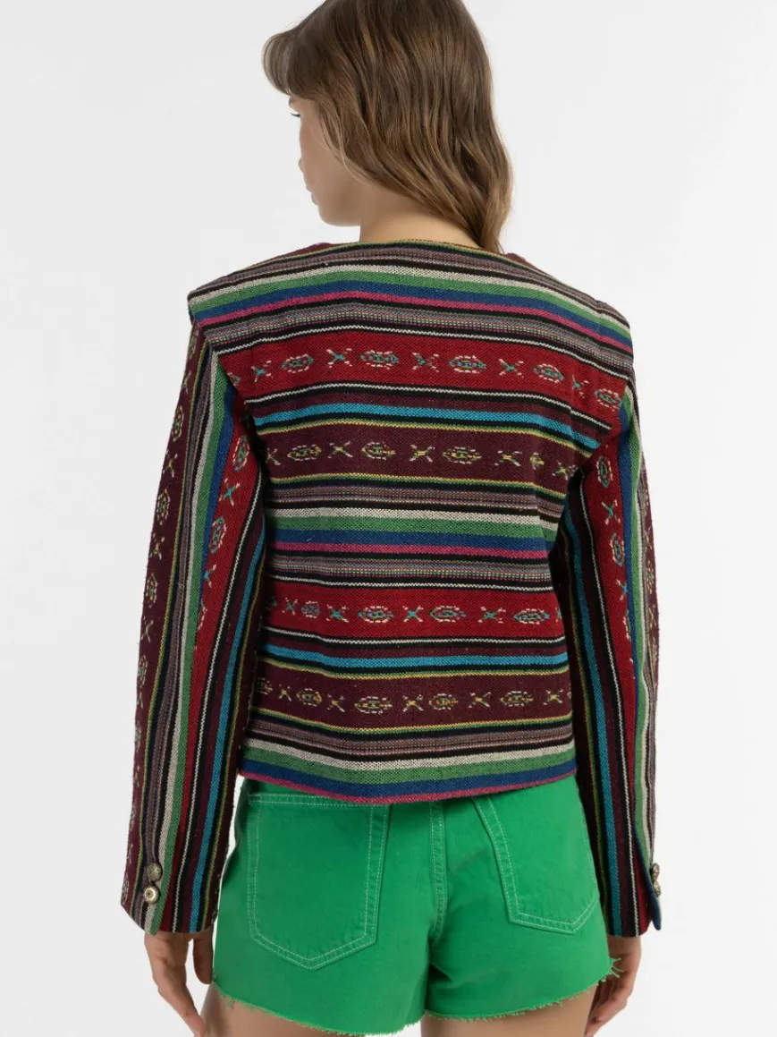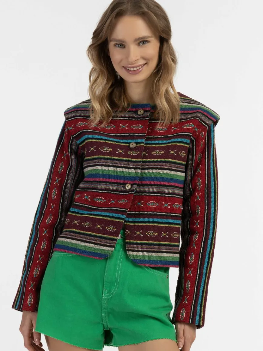 In typischer IZIA-Manier designt, begeistert uns die bunt gewebte Jacke im Ehno-Look. Gefertigt aus einem weichen Baumwollgemisch setzen Streifen und Muster die Hauptakzente. Abgerundet wird das lässige Boho-Piece durch das besondere Schulterdesign und durch die verzierten Knöpfe.