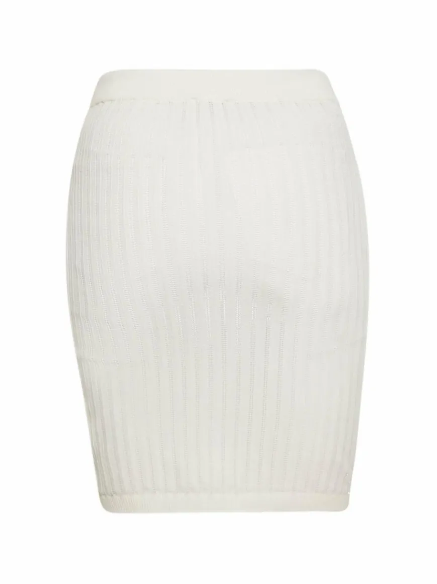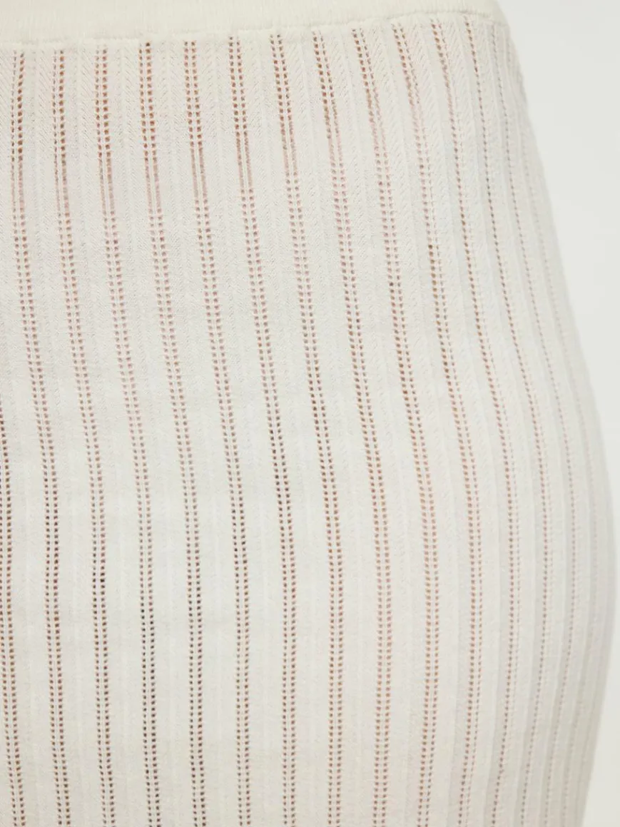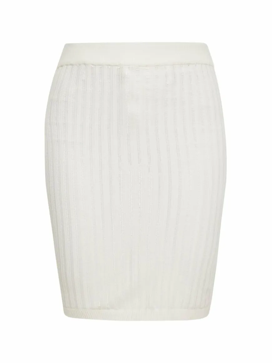 Elevate your summer wardrobe with this knitted skirt featuring a textured fabric with vertical ribbing for a sophisticated look. The fitted waistband offers a snug fit, while the form-fitting design tapers down to the knee . Made for comfort and style, this crochet skirt is perfect for summer