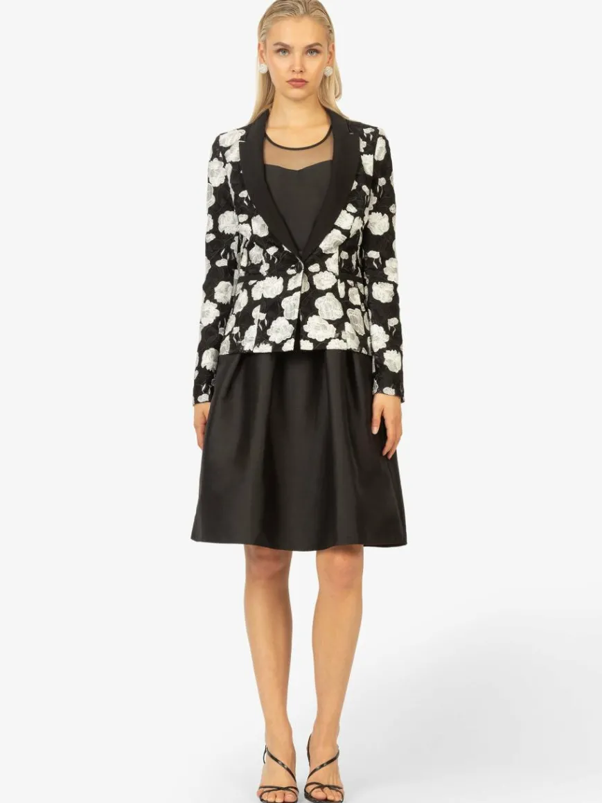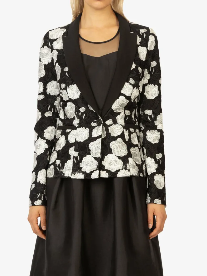 Dieser exquisite Abendblazer kombiniert klassische Eleganz mit modernem Design. Das Blumenmuster sorgt für einen luxuriösen Look, der sich perfekt für besondere Anlässe eignet. Der Schalkragen und der figurbetonte Schnitt verleihen dem Blazer eine edle Ausstrahlung, während der Knopfverschluss vorne eine stilvolle Passform garantiert. Mit langen Ärmeln und taillierter Form ist dieser Blazer ideal für formelle Events oder als edles Highlight für elegante Outfits.