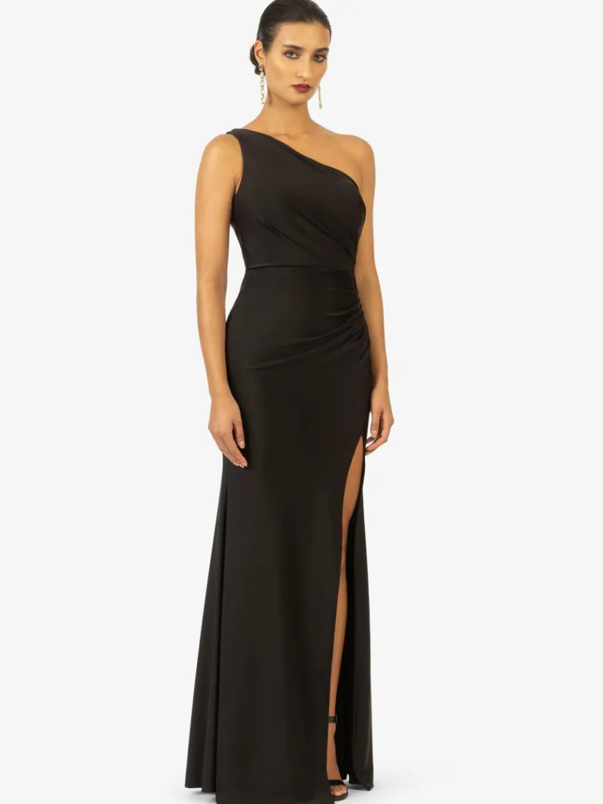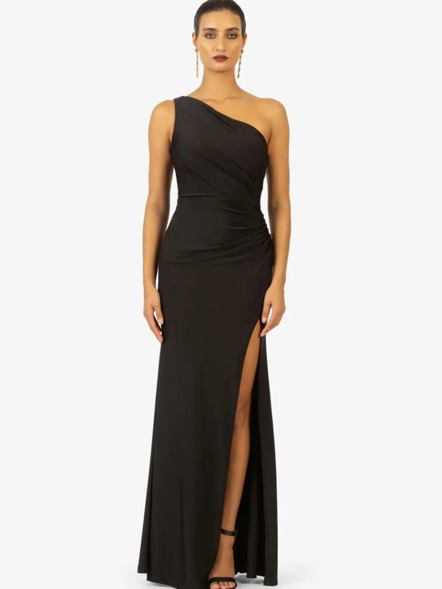 Feminin und stilvoll: Dieses figurbetonte Abendkleid mit One-Shoulder-Schnitt, edlen Raffungen und hohem Schlitz vereint moderne Eleganz mit glamouröser Ausstrahlung – perfekt für besondere Anlässe.