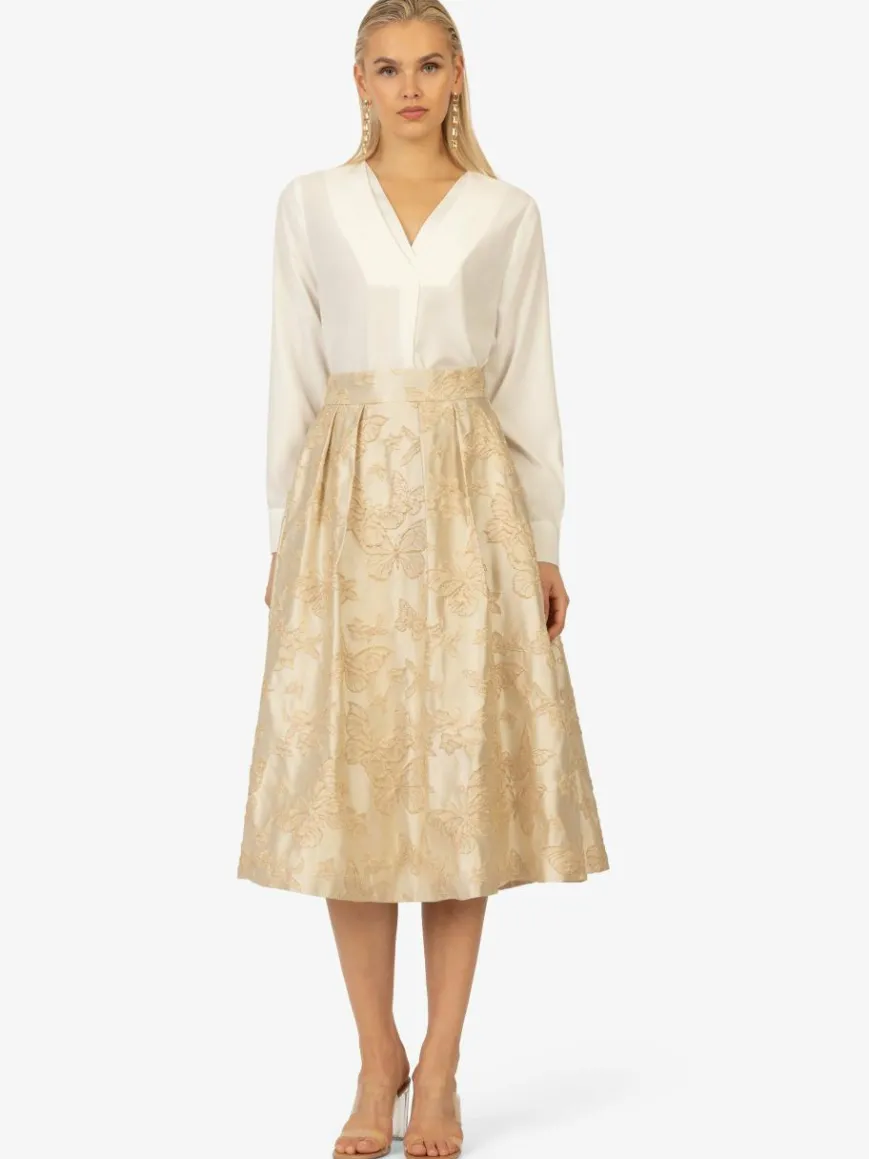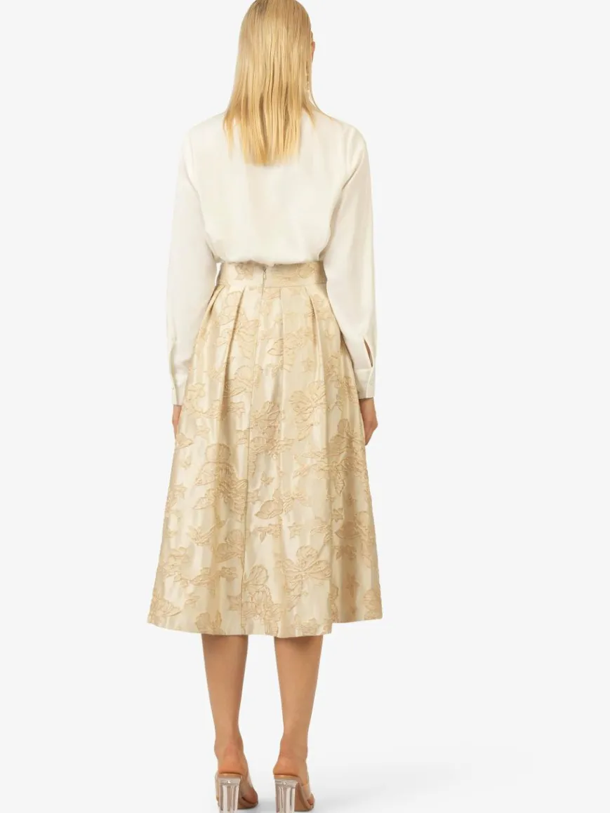 Dieser edle Abendrock besticht durch seinen hochwertigen Jacquard-Stoff mit zartem, floralen Muster. Die hohe Taille und der weit schwingende Schnitt zaubern eine feminine und stilvolle Silhouette. Die fließende Midi-Länge macht den Rock zur perfekten Wahl für elegante Abendveranstaltungen, Hochzeiten oder festliche Anlässe. Dank des verdeckten Reißverschlusses hinten lässt sich der Rock bequem an- und ausziehen, ohne die elegante Optik zu stören.