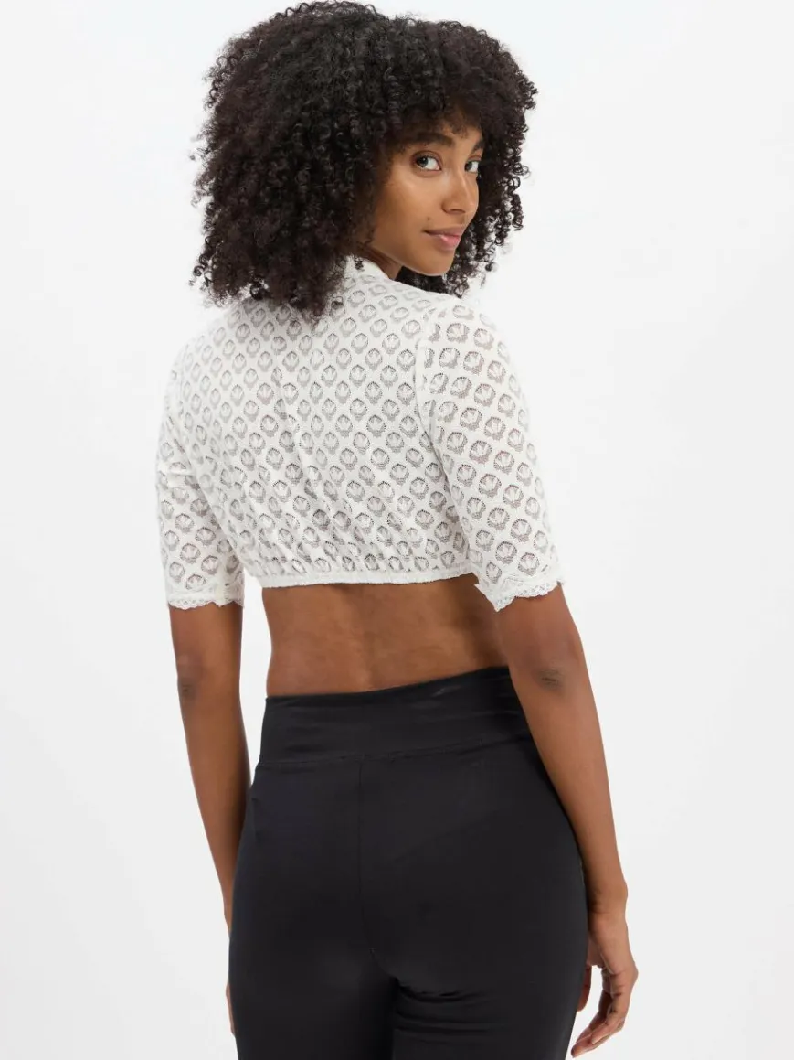Ergänzt den Trachten-Look stilvoll: die gecroppte Dirndlbluse von Krüger Dirndl aus elastischer, semitransparenter Spitze mit süßen Herz-Knöpfen am Kragen und großem Cut-out vorne.