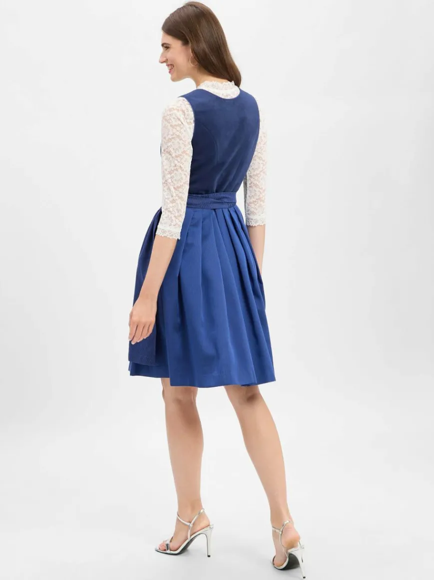 Festliches Dirndl von Krüger mit tiefem Ausschnitt, Faltenrock und Schürze mit silberner Brosche.