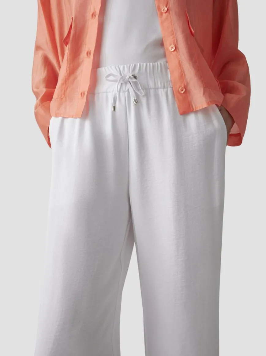 Diese unifarbene Hose überzeugt mit schlichtem Design und maximalem Komfort. Der elastische Bund mit Tunnelzug sorgt für eine flexible Passform, während der weite Schnitt Bewegungsfreiheit und Leichtigkeit garantiert – perfekt für Alltag und Freizeit.Lockerer, weiter Schnitt für ein luftiges Tragegefühl.Elastischer Gummibund mit Tunnelzug zur individuellen Weitenregulierung.Weich fließendes Material mit dezentem Glanz.Zwei seitliche Eingrifftaschen für praktische Details.Vielseitig kombinierbar – von casual bis elegant.