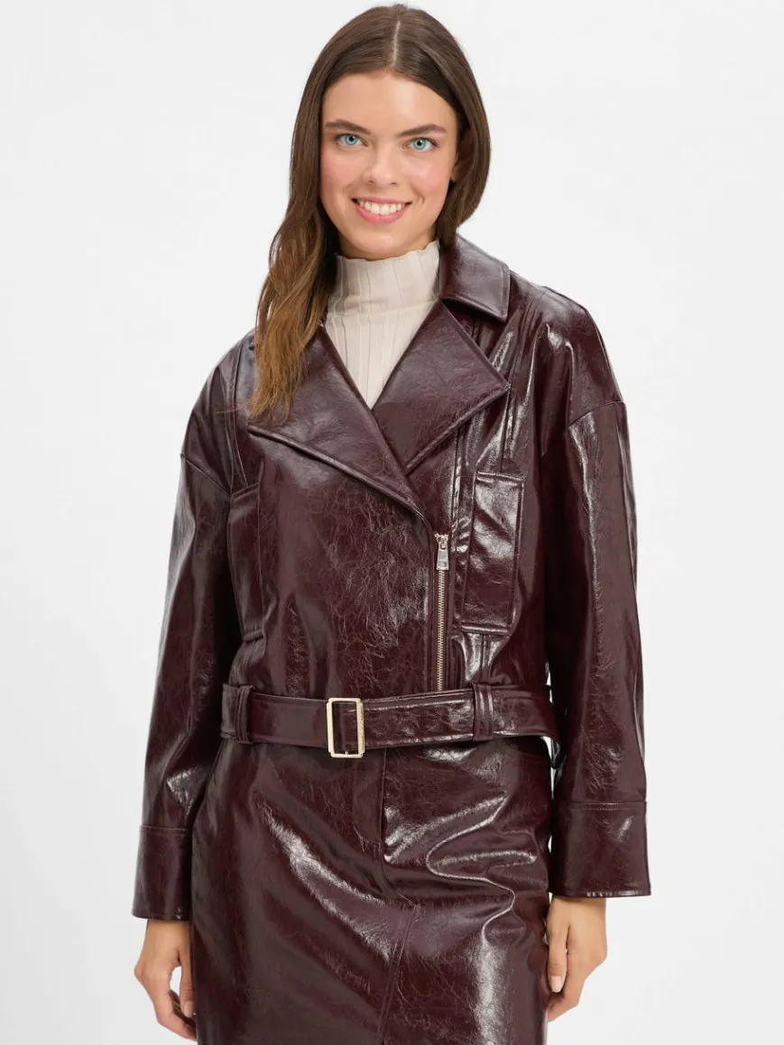 Ein stilvoller Mix aus Eleganz und sportivem Chic – die kastige Jacke von Liu Jo Collection setzt mit Glanzleder-Optik und Bindegürtel samt Metallschnalle markante Akzente.