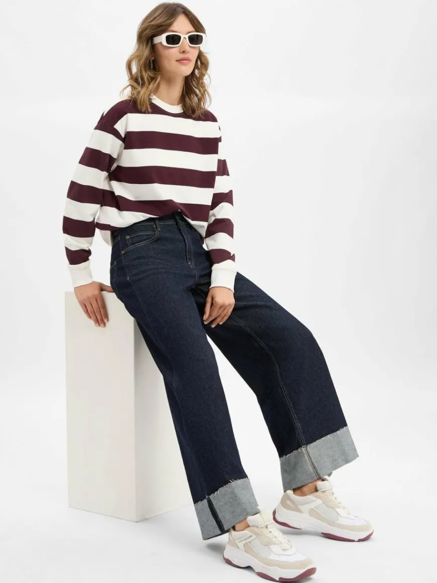 Die MAC Jeans Nevada ist eine modische Damenhose mit extraweitem, geradem Bein und einem offenen, breit umgeschlagenen Saum, gefertigt aus hochwertigem Denim für maximalen Komfort.