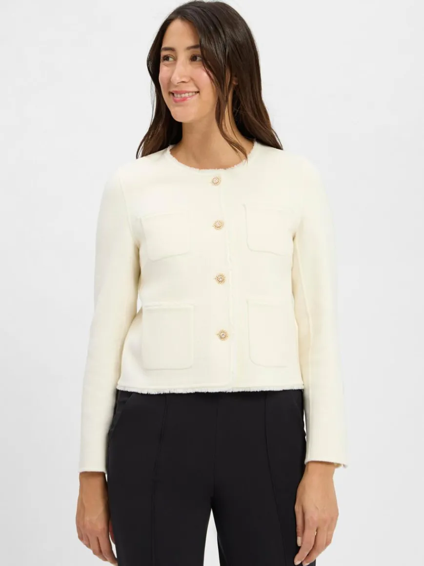 Der Mix aus feinen Fransen an den Abschlüssen, glitzernden Knöpfen und weicher Wolle gibt dem Marc Cain Collections Blazer seinen exklusiven Look.