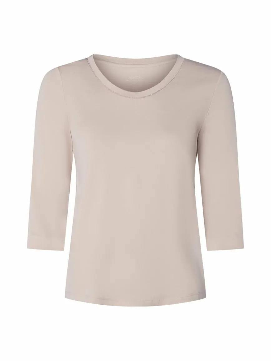 Das Shirt von Marc Cain Collections überzeugt mit seiner stretchigen Baumwollqualität und einer feinen Stickerei am Halsausschnitt – ein elegantes Detail für einen stilvollen Auftritt.