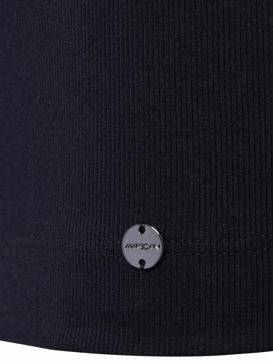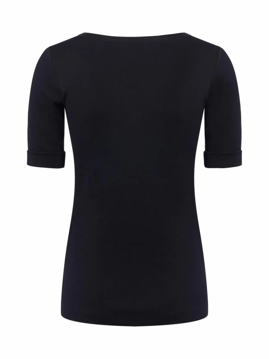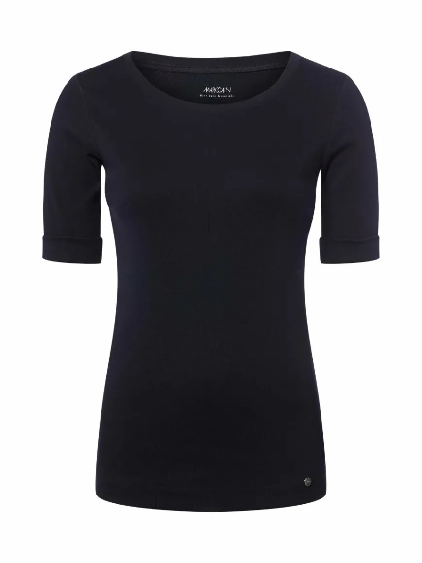 Das fein gerippte Jerseyshirt von Marc Cain Collections ergibt im puristischen Design mit halblangen, krempelbaren Ärmeln und tonigen Overlocknähten ein perfektes Essential für diverse Looks von casual bis smart.