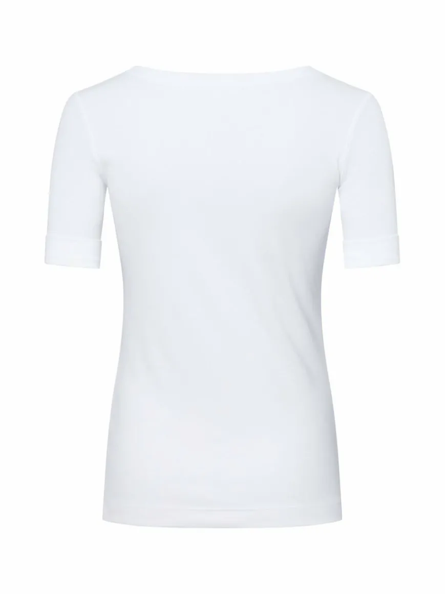 Das fein gerippte Jerseyshirt von Marc Cain Collections ergibt im puristischen Design mit halblangen, krempelbaren Ärmeln und tonigen Overlocknähten ein perfektes Essential für diverse Looks von casual bis smart.