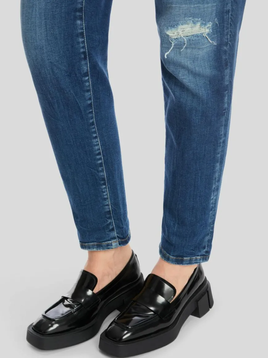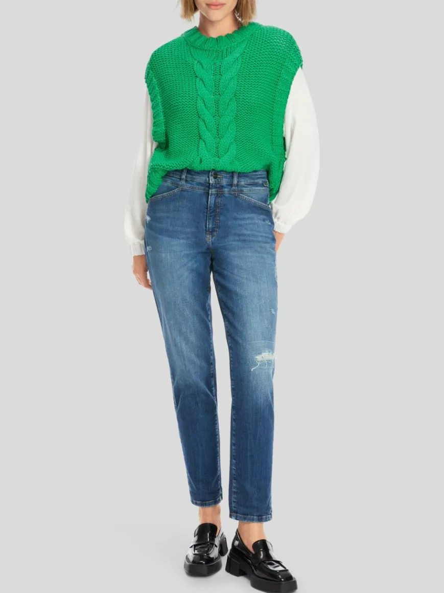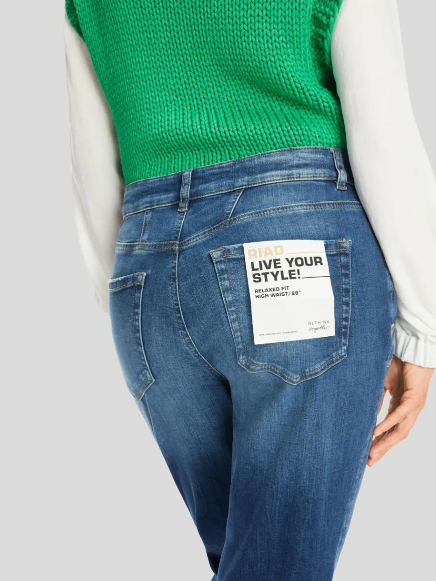 Modell RIAD kommt mit Relaxed Fit, hoher Taille und verkürztem Bein. Charakteristisch ist die Teilungsnaht unter dem Bund und die damit verbundene Taschenform. Blickfang: authentische Destroyed-Effekte und Flicken im Vorderteil. Der Denim ist aus stretchiger Biobaumwolle, die eine tolle Passform und Formbeständigkeit bietet. Das Modell ist nach Gebrauch biologisch abbaubar und trägt das Nachhaltigkeitslabel
