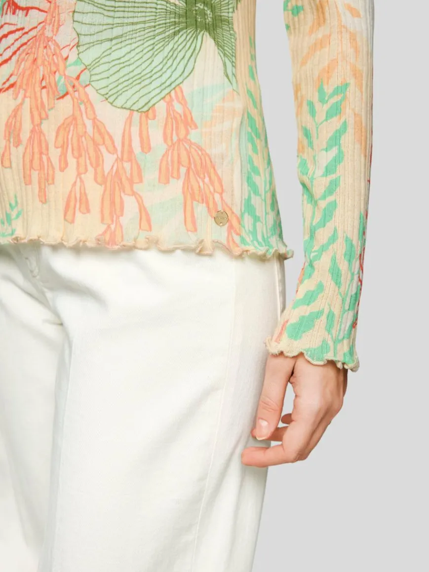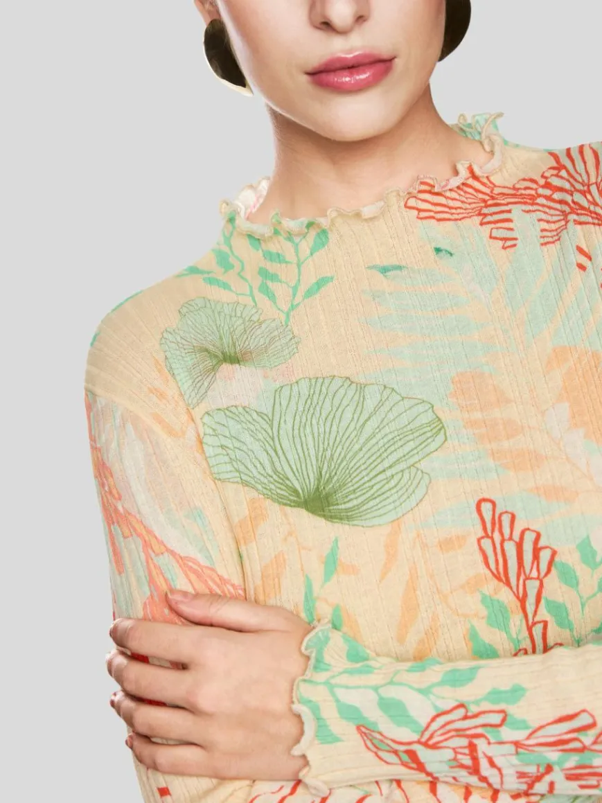 Eng anliegendes Strick Shirt mit floralem Muster. Den Stehkragen und den Saum des Shirts zieren kleine Volants. Das Modell ist „Knitted in Germany“: Das Verstricken der Garne auf hochmodernen Strickmaschinen und die Veredelung der Stoffe geschehen am Standort Deutschland. Zusammengenäht werden die einzelnen Teile wie Ärmel, Vorderteil etc. in europäischen Partnerbetrieben.