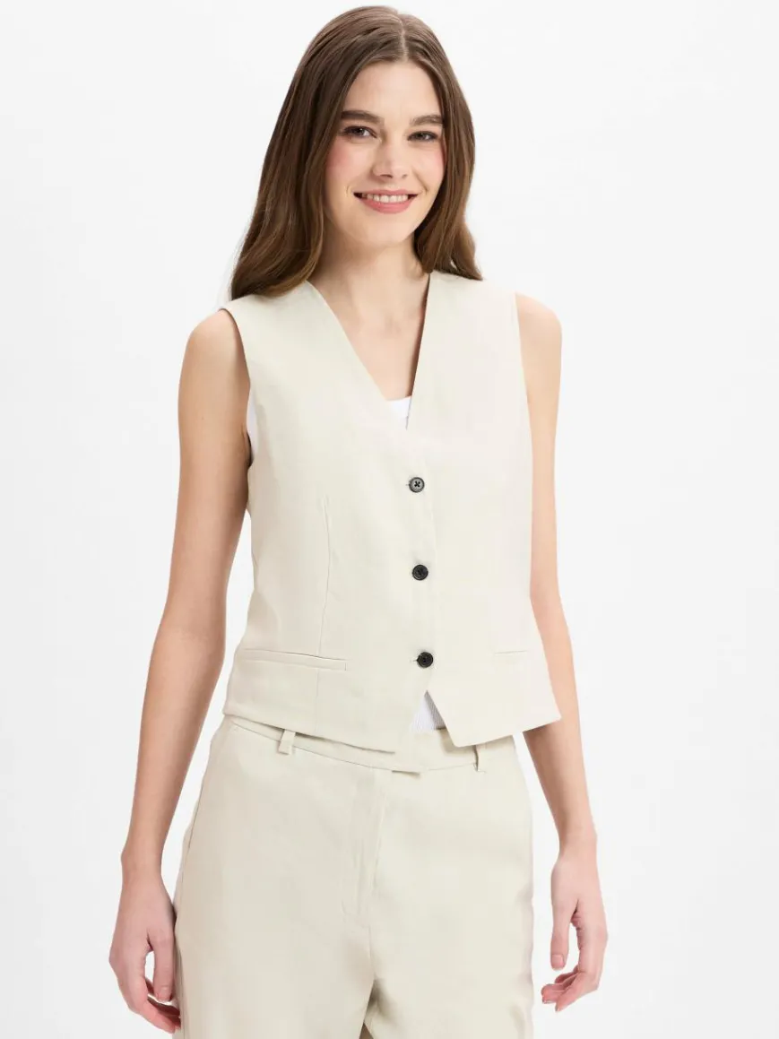 Die elegante Anzugsweste von Marc O’Polo, zusammen mit der perfekt abgestimmten Hose, bildet ein stilvolles Ensemble, das bei jeder Gelegenheit glänzt und aus einem angenehm leichten Leinen-Viskose-Mix gefertigt ist.
