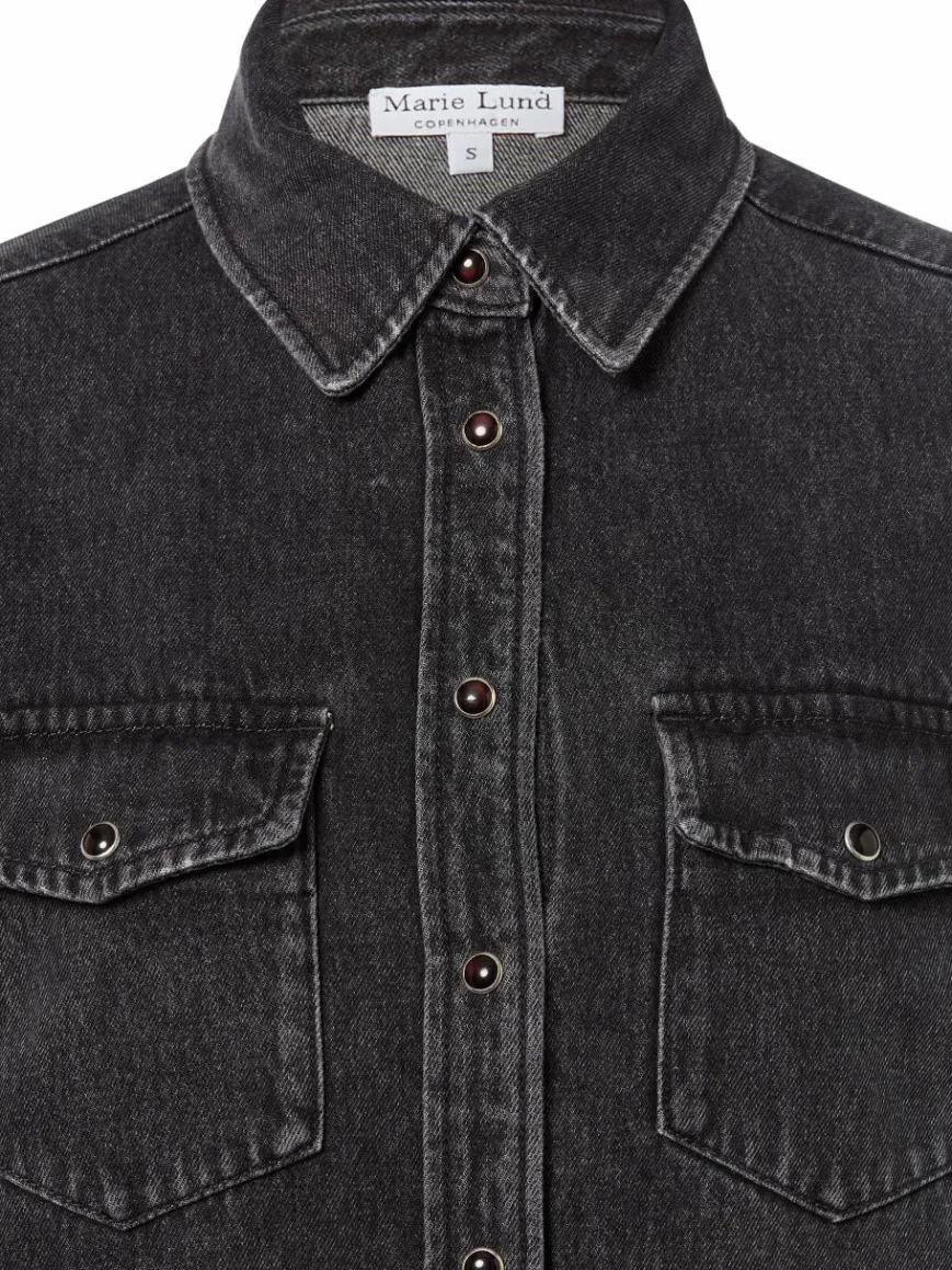 Die glänzenden Druckknöpfe akzentuieren das lässig verwaschene Design der Marie Lund Jeansbluse wirkungsvoll.