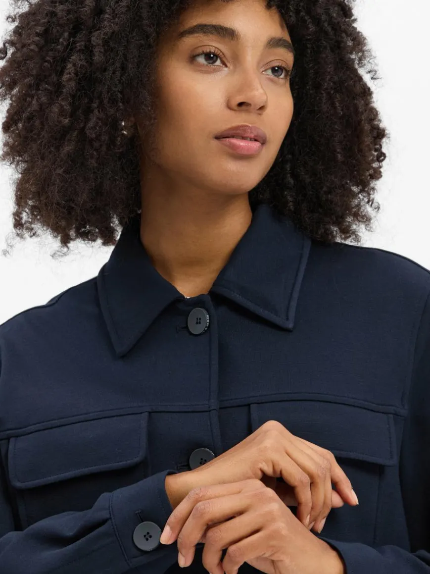 Die More & More Blazerjacke schafft einen perfekten Mix aus klassisch-eleganten Elementen wie dem Umlegekragen und sportiven Details wie der Jersey-Qualität und plakativen Brusttaschen.